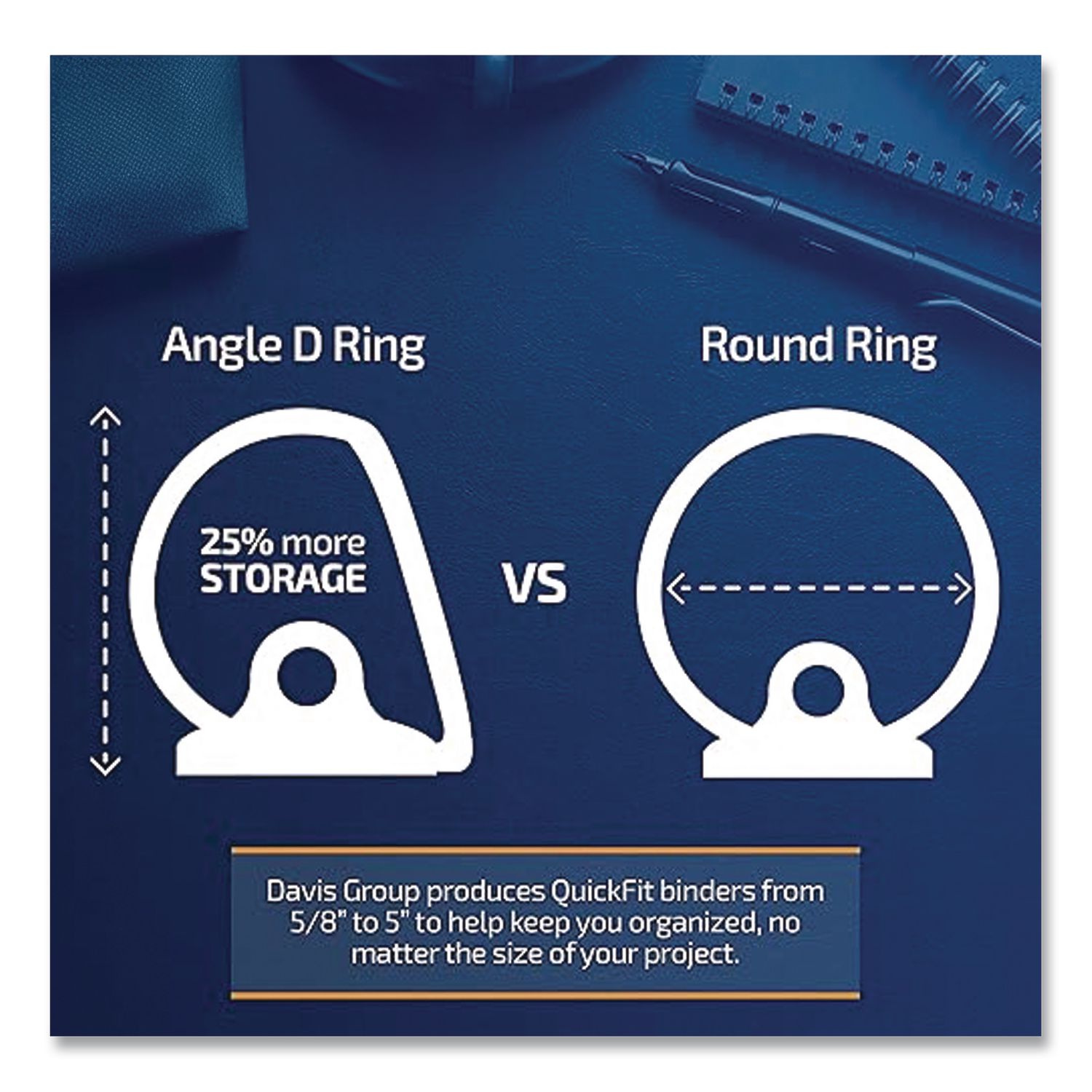 Features a unique QuickFit® overlay design that allows you to use a single sheet of paper to create a custom one-piece presentation insert that wraps around the spine to the the front cover for easy insertion and quick identification. The angled D-rings hold 25 percent more pages than standard round rings of the same size, making the binder ideal where space is at a premium. Binder Type: Ring; Binder Style: View; Binder Size Capacity: 5″; Binder Sheet Capacity: 1,000.