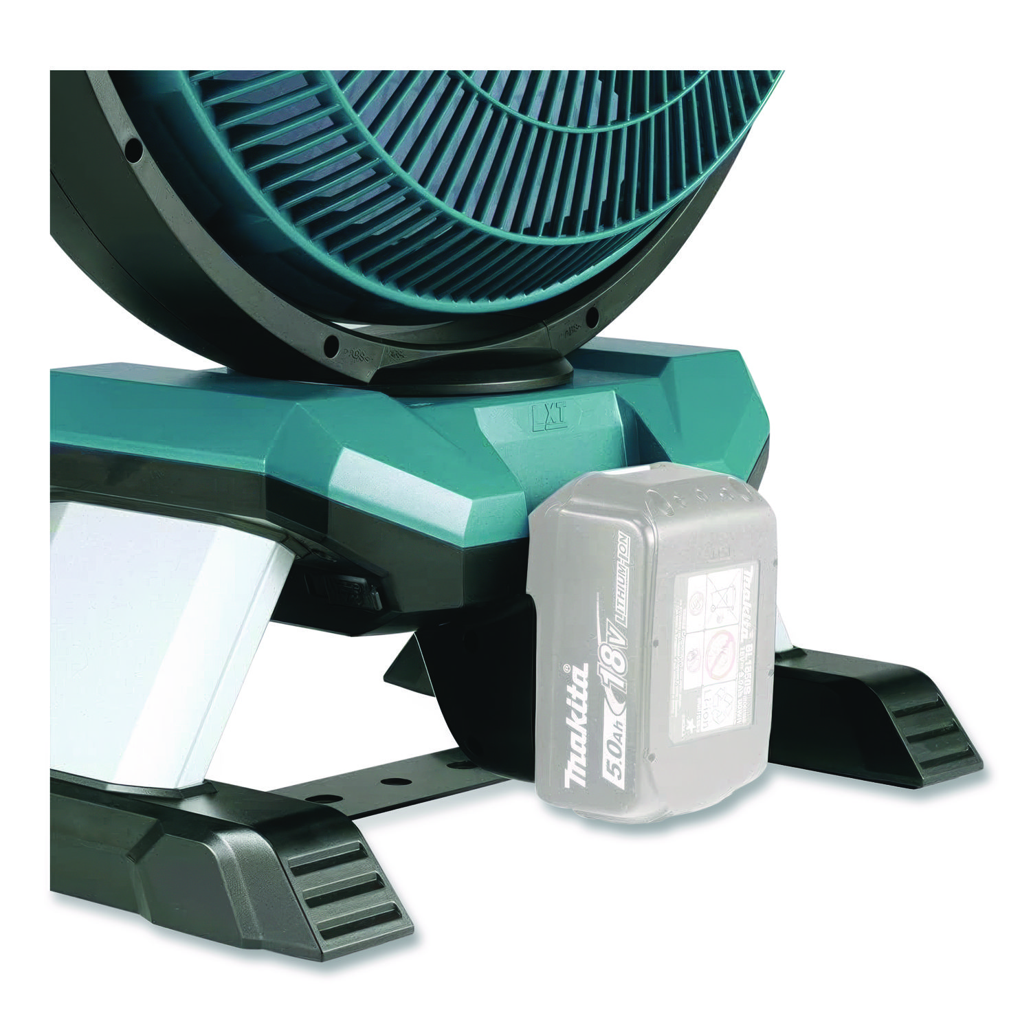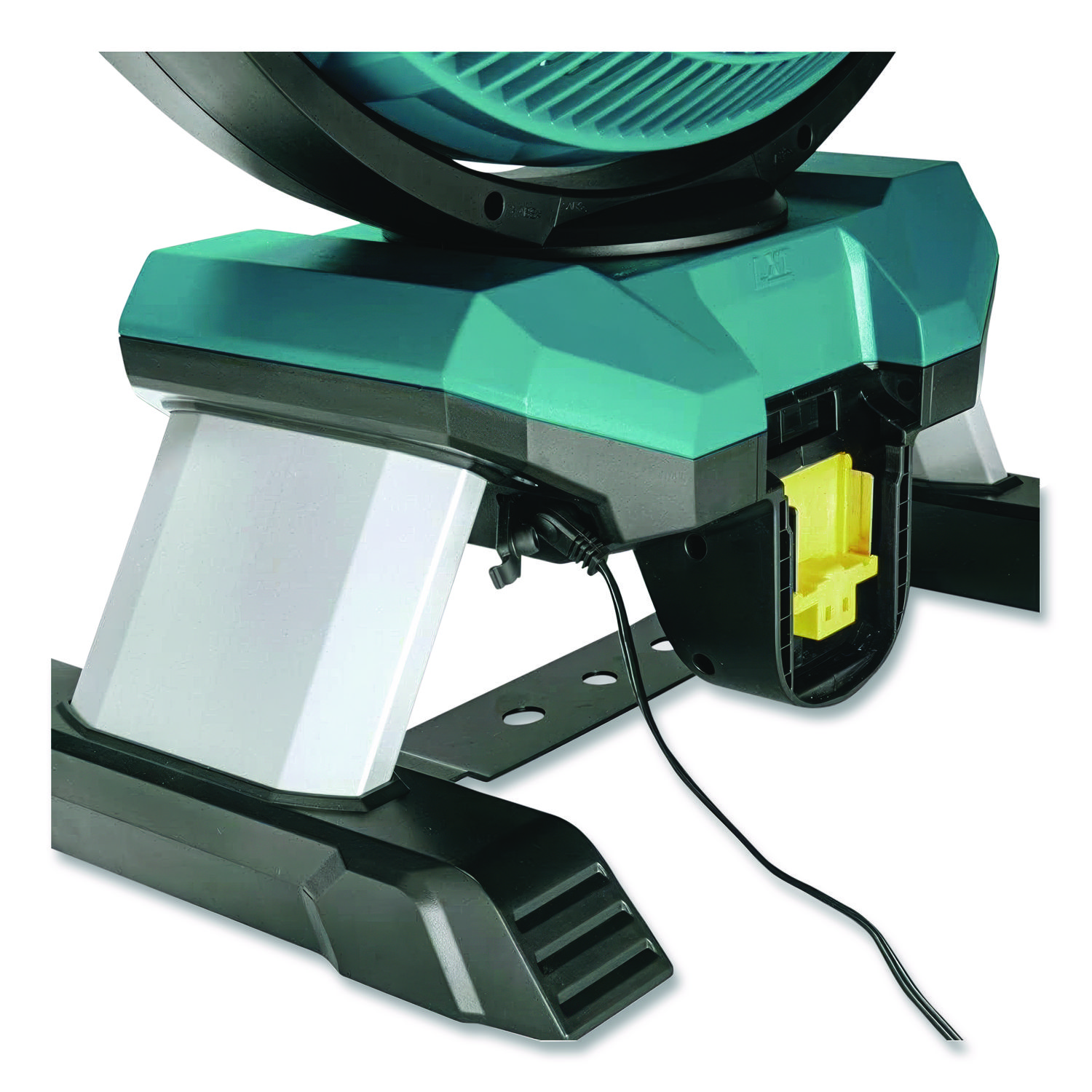 Portable and powerful cordless solution for contractors. Get up to 11.8 hours of portable air flow on a single charge of an 18V LXT Lithium-Ion 5 Ah Battery (sold separately). This fan is ideal for improved air circulation in close quarters, increased air flow for painters, and more. Three speed settings and an oscillation selector allow the user select optimal air velocity and control. It delivers 740 CFM of air flow on High. For added convenience, the fan operates on 18V LXT Batteries or AC Power (cord included). It also has a handle for easy transport and can be mounted onto a tripod (sold separately). It is part of Makita’s 18V LXT System. The LXT Cordless System, the world’s largest cordless tool system powered by 18V Lithium-Ion slide-style batteries, takes a user from power tools to outdoor power equipment to get the job done. Makita 18V LXT Batteries have the fastest charge times in their categories, so they spend more time working and less time sitting on the charger. For improved tool performance and extended battery life, Makita created Star Protection Computer Controls. Star Protection is communication technology that allows the Star Protection-equipped tool and battery to exchange data in real time and monitor conditions during use to protect against overloading, over-discharging and overheating. For increased versatility, the tool can also be powered by Makita 18V LXT Lithium-Ion Batteries with the star symbol on the battery indicating Star Protection inside. Fan Head Size: 13″; Fan Type: Oscillating; Color(s): Teal/Gray/Black; Height (Max): 23.75″.