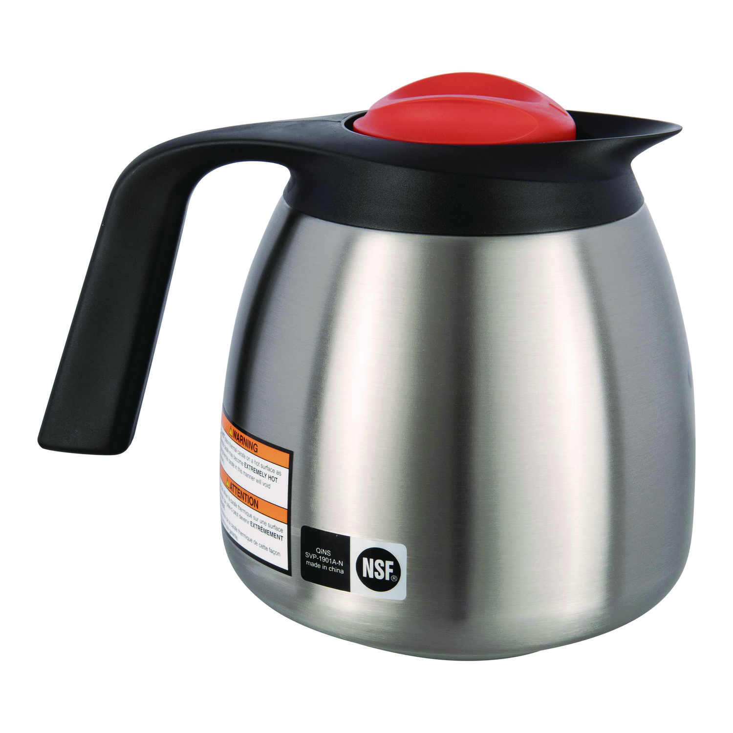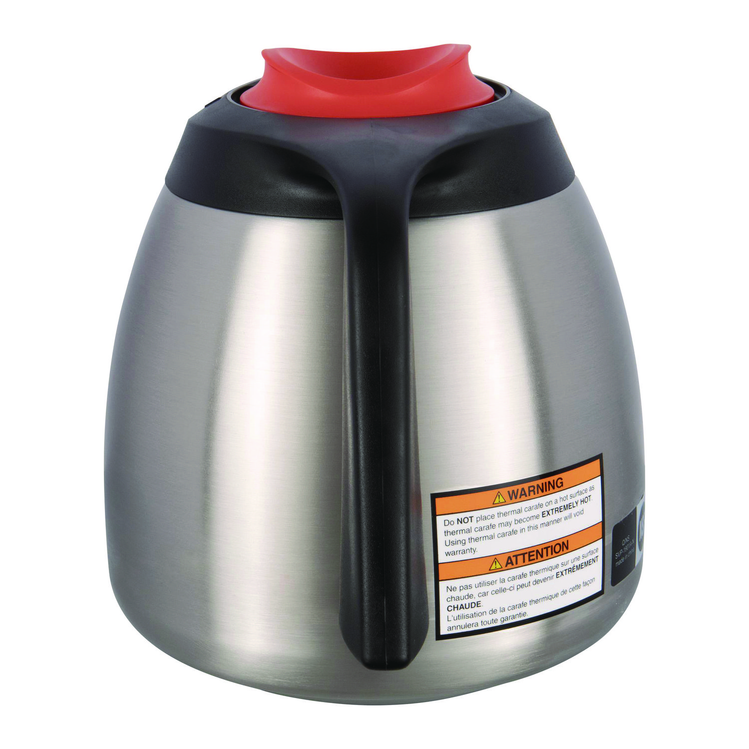 Ensure your coffee is ready when you need it, with a thermal carafe that keeps coffee hot and fresh for hours. Conveniently portable. Maintains an optimum flavor profile without the need for warming plates. Sleek, black-and-steel design is elegant, complementing almost any kitchen setting. Material(s): Stainless Steel/Plastic; Color(s): Stainless Steel/Black/Orange; Interior Volume Capacity: 64 oz; Warmer: No.