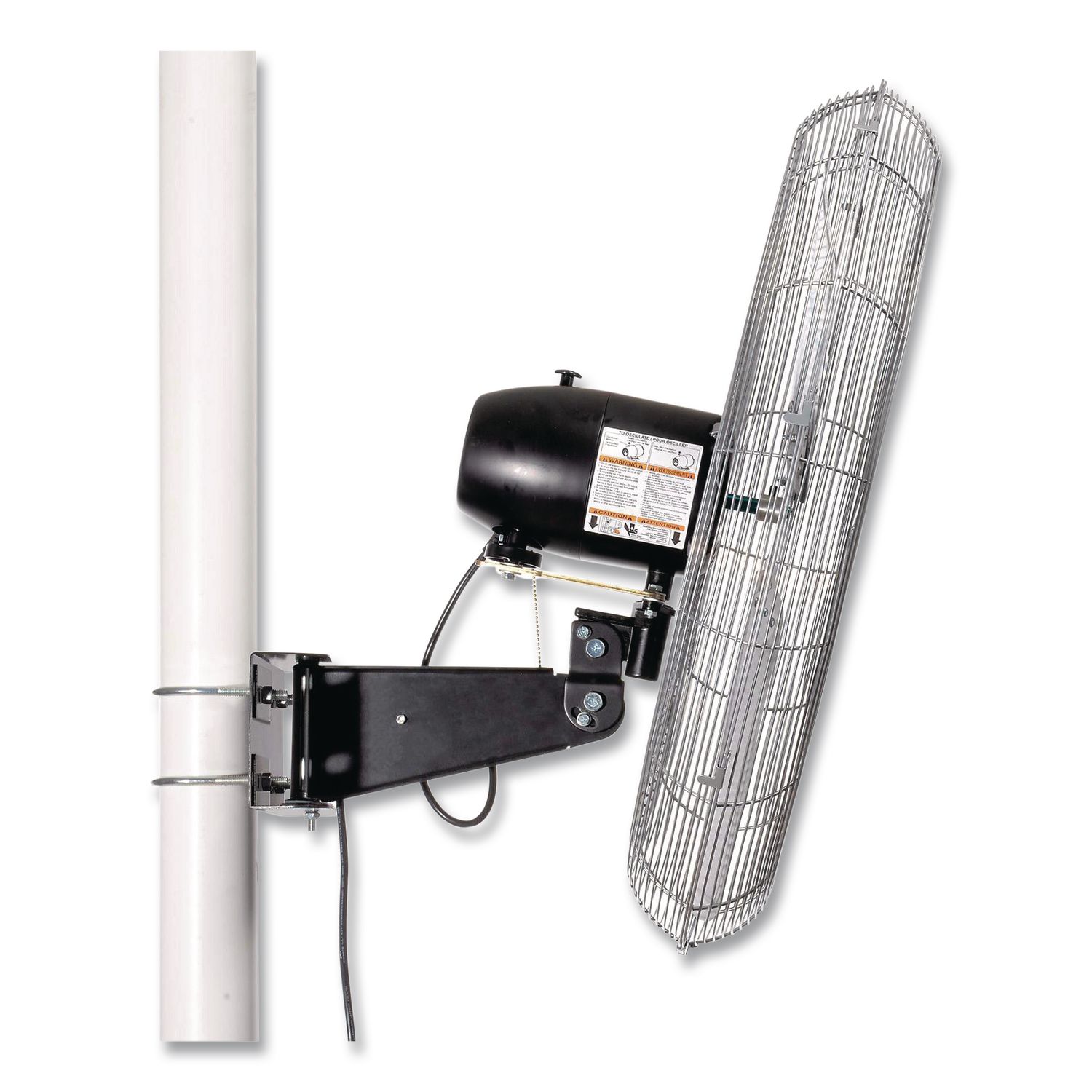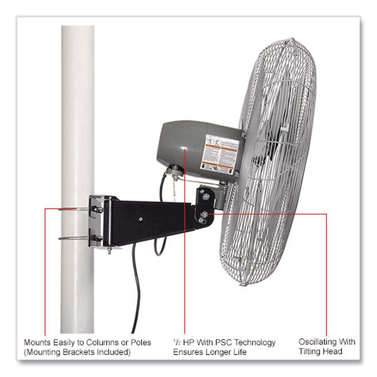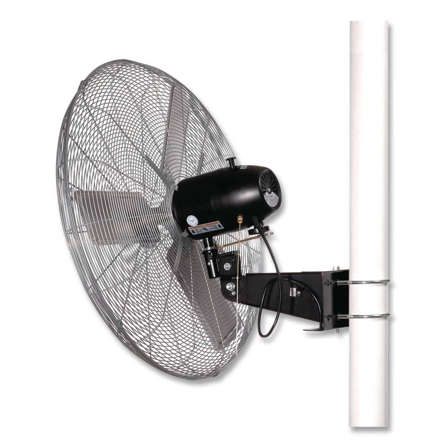 Provides refreshing air flow without taking up valuable floor space in any setting like loading docks, offices, schools, offices and kitchens. This fan easily attaches to columns or poles with included mounting bracket. It has an efficient three-speed open-air over PSC-type ball bearing motor. Quiet metal fan blades are balanced for optimum air distribution and enclosed in steel wire guards for safety with a safety-clutch oscillating mechanism that prevents jamming. A simple push button gives you the option to keep the head fixed in one direction or 80° oscillating operation with the ability to tilt it for perfect air-flow placement. Pull chain on/off. Fan Head Size: 30″; Fan Type: Industrial; Oscillates: Yes; Color(s): Silver.