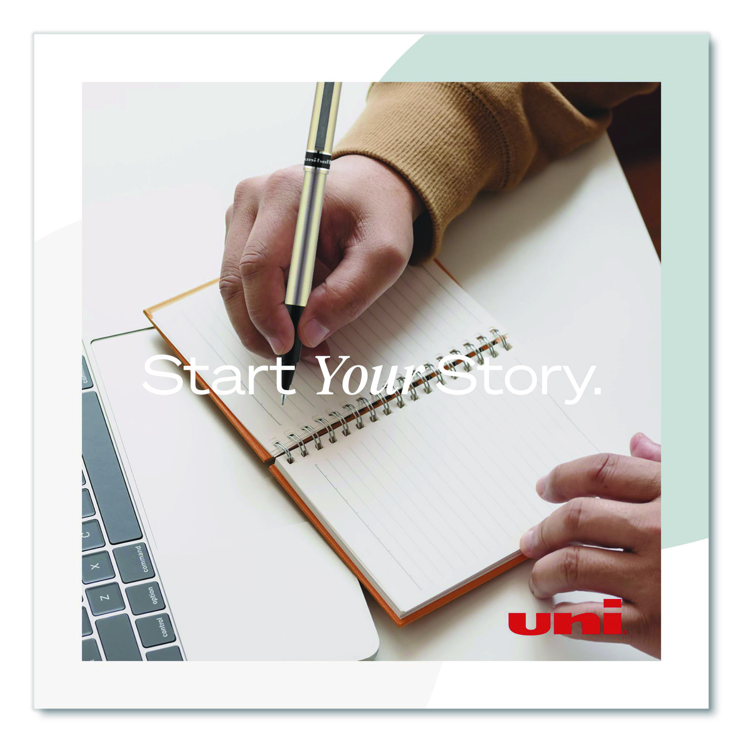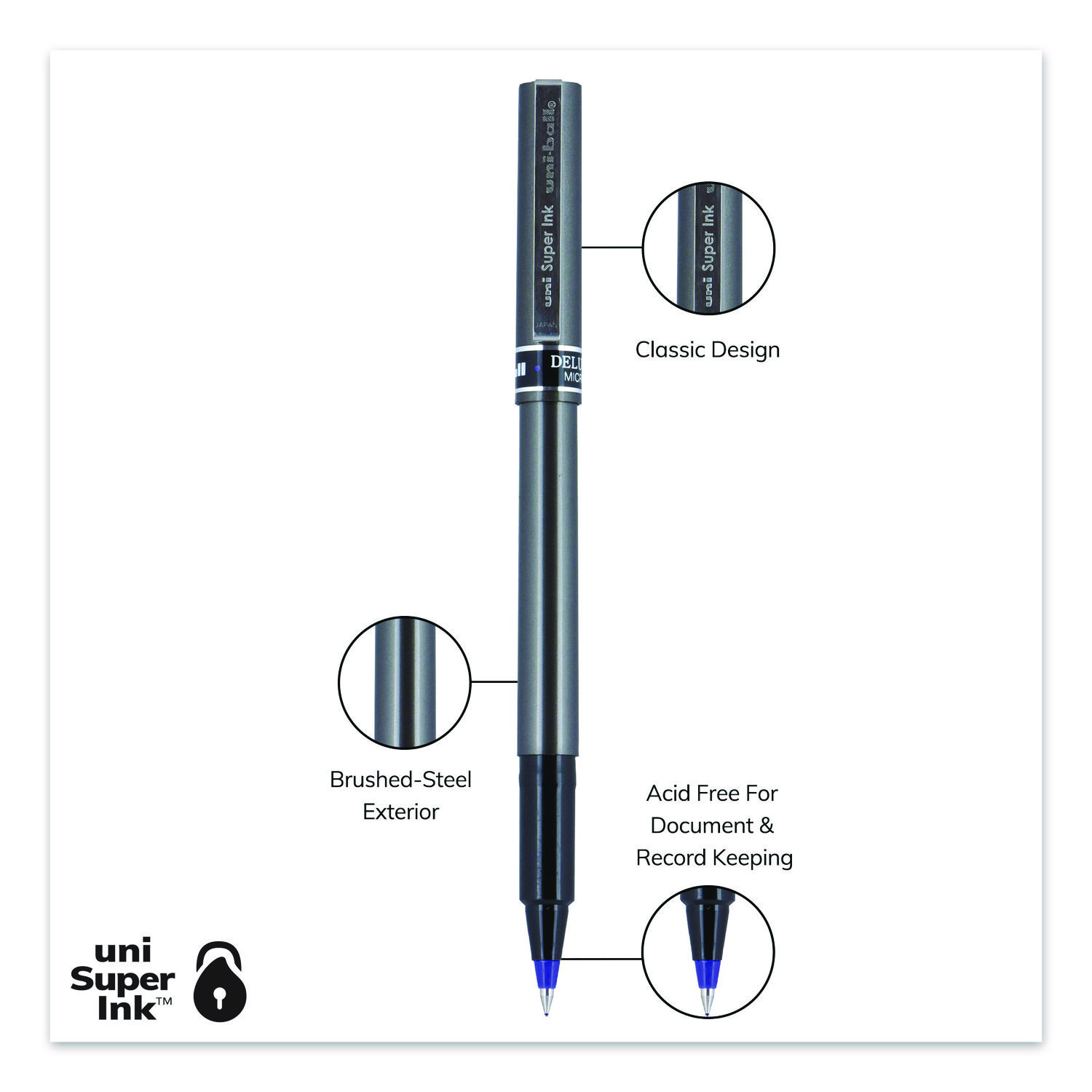 Introduce sophisticated style to your everyday writing with uniballĀ® Deluxe Stick Roller Ball Pens. Even-flowing, acid-free liquid ink delivers intense, vibrant performance. Strong, precision tips render crisp lines with unparalleled definition, making it easy to create super fine details in your drawings and diagrams. uni Super Ink technology ensures their ink settles deep into paper for three-way protection against water, fading and fraud. Deluxe Stick Roller Ball Pens are also versatile, ideal for drawing, notetaking and more whether it’s at work, in school or at home. Pen Sub-Brand & Product Family: Deluxe; Pen Type: Rollerball Pen; Pen Style: Stick; Pen Tip Type: Conical.