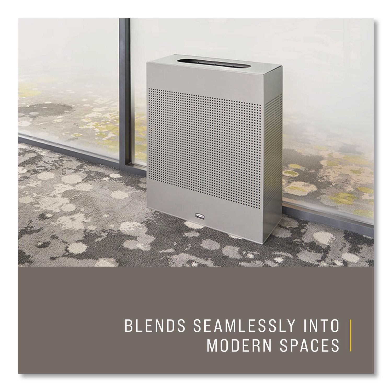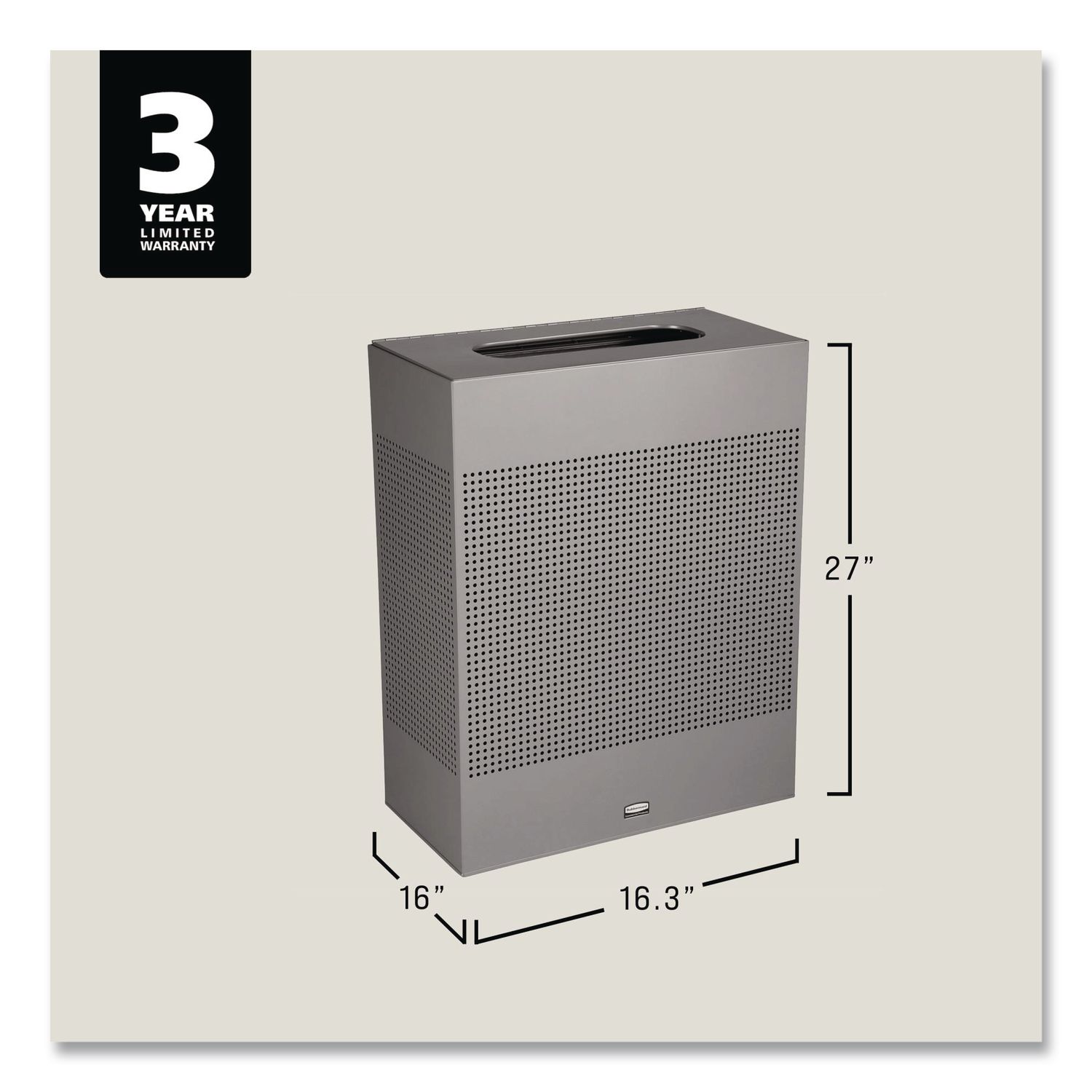 Offers functional litter control in an elegant design. The garbage can has an open top with a vinyl trimmed disposal opening. The trash can is made of fire-safe steel. Its wall-hugging design is ideal for areas where looks are important and space is limited. The lift-off trash can body makes it easier to empty and has a rigid plastic liner that will not leak. Open Top Receptacle; Rectangular. Waste Receptacle Type: Indoor All-Purpose Waste Bin; Material(s): Steel; Application: Indoor All-Purpose Waste Disposal; Interior Volume Capacity: 22.5 gal.