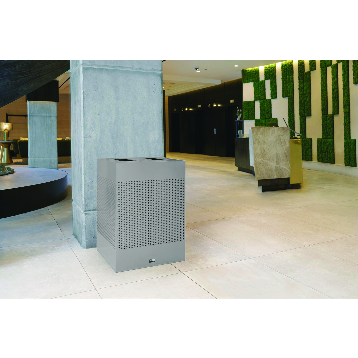 Offers functional litter control in an elegant design. The garbage can has an open top with a vinyl trimmed disposal opening. The trash can is made of fire-safe steel. Its wall-hugging design is ideal for areas where looks are important and space is limited. The lift-off trash can body makes it easier to empty and has a rigid plastic liner that will not leak. Waste Receptacle Type: Indoor All-Purpose Waste Bin; Material(s): Steel; Application: Indoor All-Purpose Waste Disposal; Interior Volume Capacity: 34 gal.