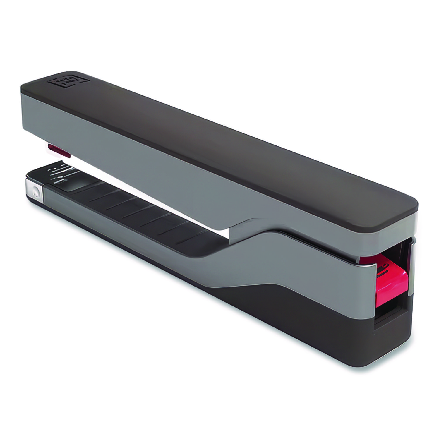 Load staples and bind paperwork with this stapler. The built-in low staple indicator lets you monitor supply, while the sliding anvil offers two ways of getting the job done. A front-loading tray easily opens at the push of a button for seamless operation. High Capacity Stapling: No; Flat Clinch Plate: No; Tacking: No; Staple Capacity: Full Strip (210 Staples).