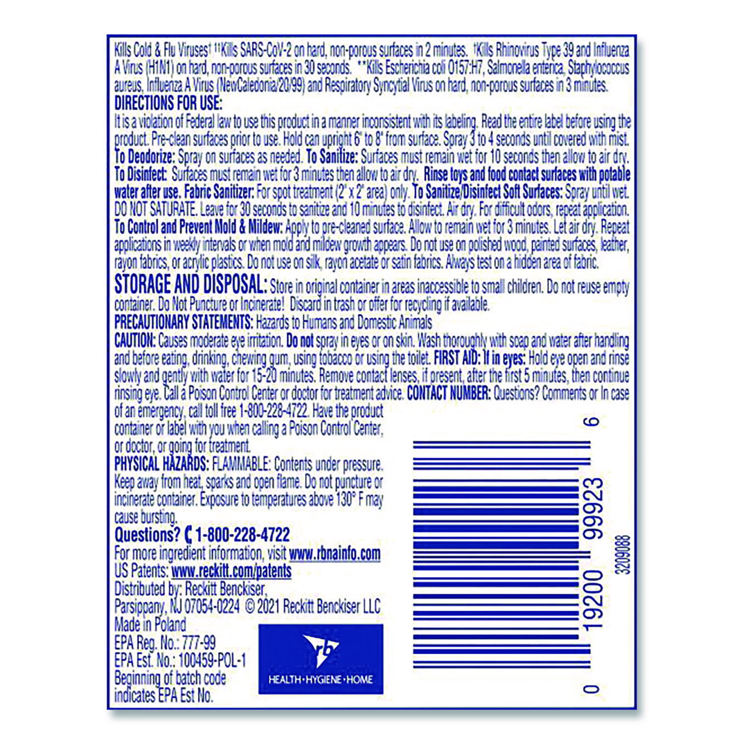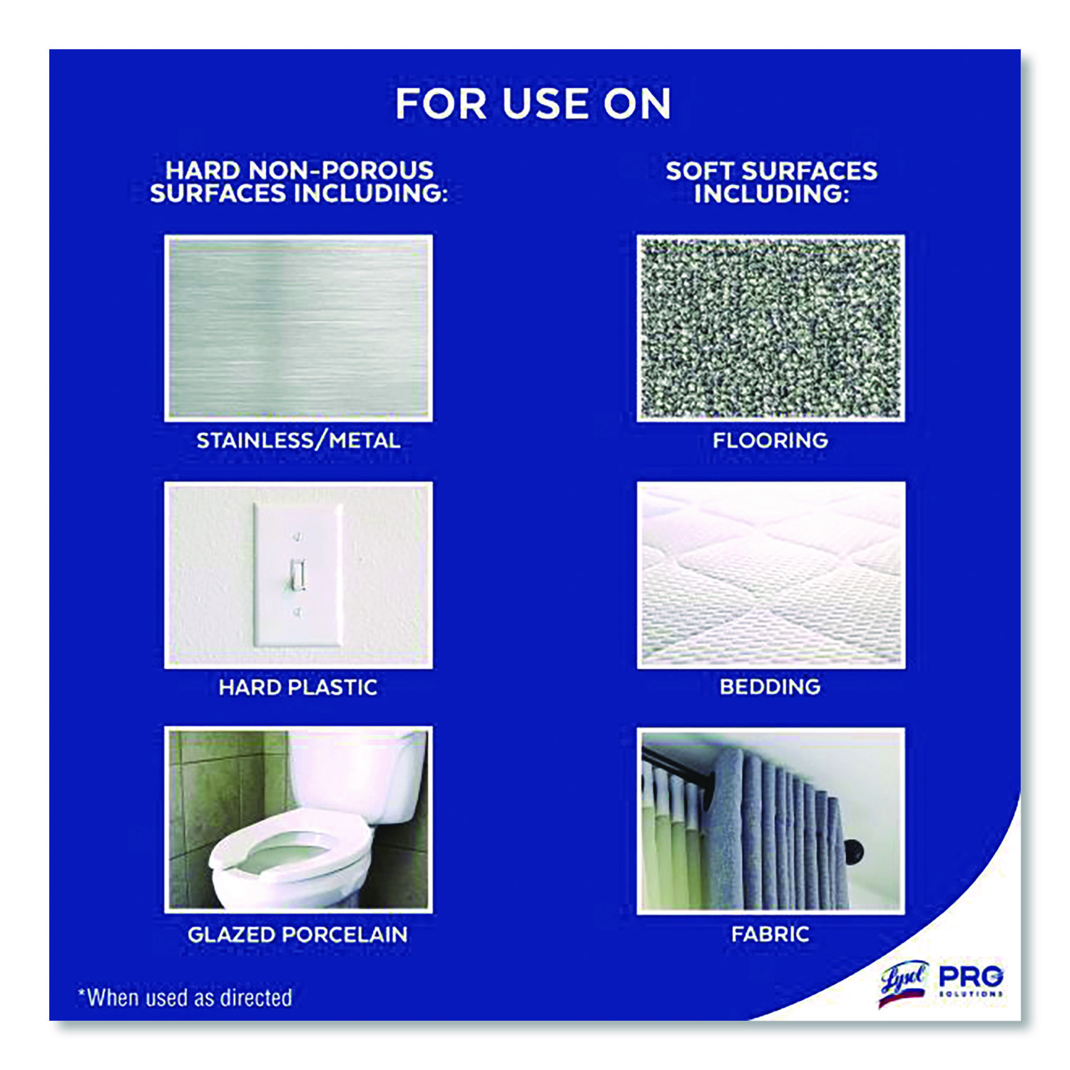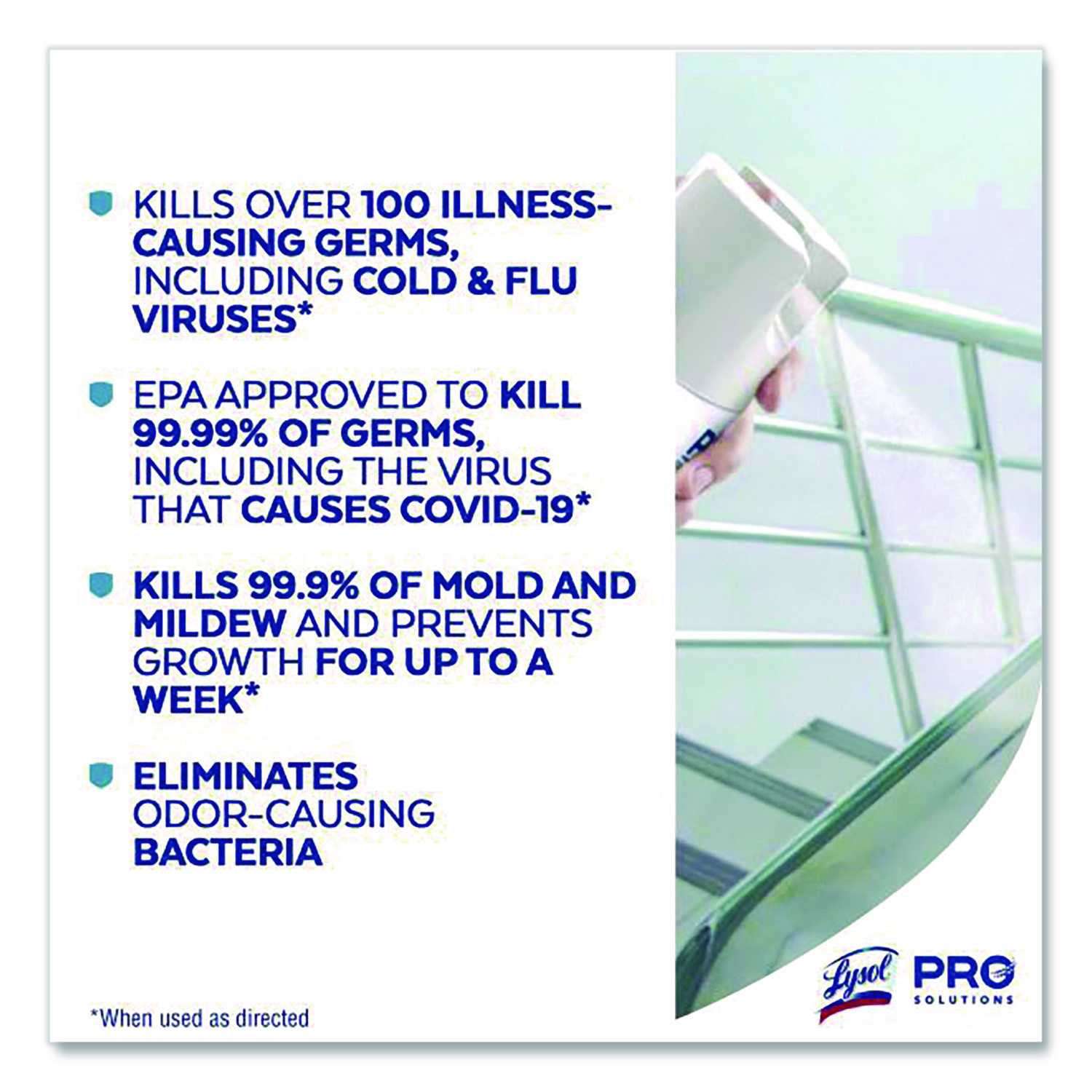 Build confidence and reassure customers by giving them Lysol Disinfectant Spray in a portable size. Lysol kills 99.9% of viruses and bacteria, including the virus that causes COVID-19 in 15 seconds, as well as cold and flu viruses when used as directed. Help protect high-traffic areas and high-touch surfaces, including desks, bathrooms, doorknobs, and railings. Deliver hospital-type disinfection on soft surfaces, including upholstery, curtains, sofas, mattresses, and cushions. Meet customer and staff expectations around disinfection. Simply spray and let air dry. Application: Disinfectant/Sanitizer; Applicable Material: Bedding; Fabric; Flooring; Hard Non-Porous Surfaces; Hard Plastic; Glazed Porcelain; Metal; Stainless Steel; Chemical Compound: Alkyl (50% C14, 40% C12, 10% C16) Dimethyl Benzyl Ammonium Saccharinate; Ethanol; Dirt Types: Bacteria; Fungus; Germs; Mildew; Mold; Viruses.