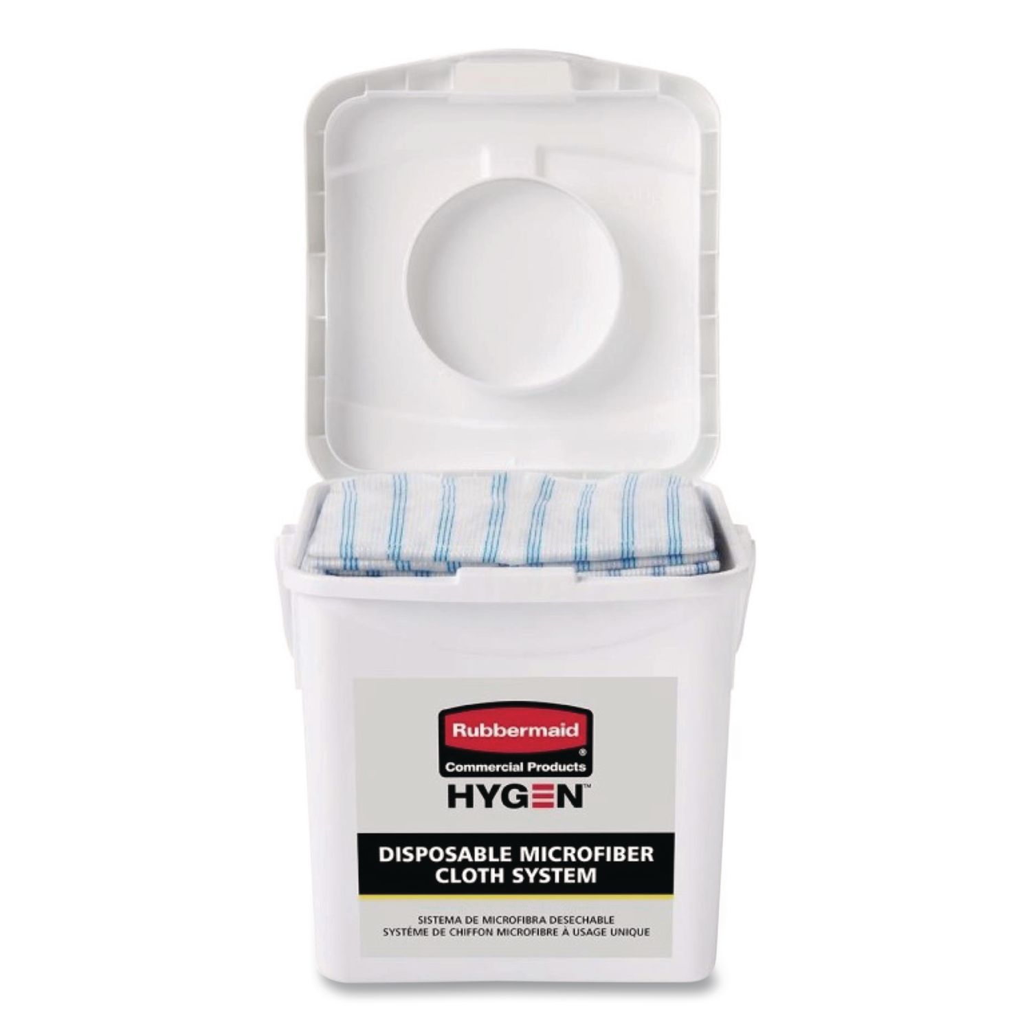 The HYGEN™ Disposable Microfiber Charging Bucket is designed to hold up to 60 HYGEN™ 12″ x 12″ Disposable Microfiber Cloths (sold separately) and a facility’s preferred solution to create disposable pre-treated wipes with the microbe removal power of microfiber. Handle makes transport from one area to another easy. Labels provide clear instructions and a space for chemical label. Pull-through top allows for easy dispensing of cloths. Towels Dispensers Type: Wiper Dispenser; Dispenser Capacity (text): 60 Disposable Cloths; Material(s): Plastic; Color(s): White.