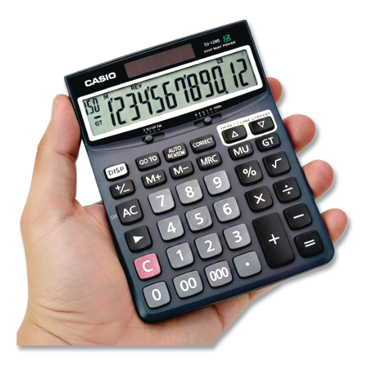 A business printing calculator without the paper. Twelve-digit desktop calculator that allows you to check up to 150 steps and make corrections. Double zero and triple zero (00, 000) keys let you imput large numbers. Backspace key erases mistakenly entered digits and helps you from having to start over. Other functions include review and auto review, go-to function, correct key, GT memory and three-key memory. Power Source(s): Battery; Solar; Display Notation: Numeric; Number of Display Digits: 12; Display Characters x Display Lines: 12 x 1.