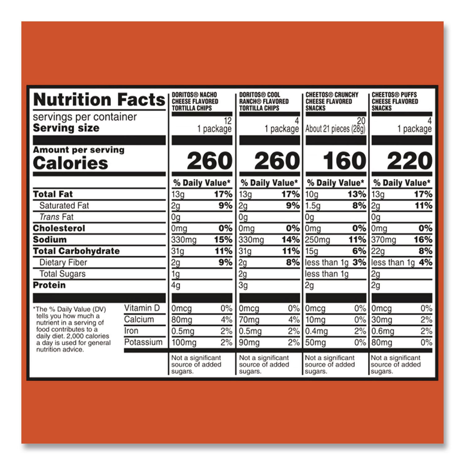 Frito-Lay Variety Packs provide the perfect portion size and variety to keep your entire family happy. No matter what the occasion from stocking the pantry, to your next family party, to the lunch box, or even a desk break, all you have to do is grab a pack and go! Whether you’re in the mood for a cheesy snack or Doritos chips, this variety pack has it all. Food Type: Chips; Flavor: Cheetos Crunchy; Cheetos Puffs; Cool Ranch Doritos; Cheese Doritos; Capacity (Weight): 2 oz; 1.38 oz; (2) 1.75 oz; Sugar Free: No.