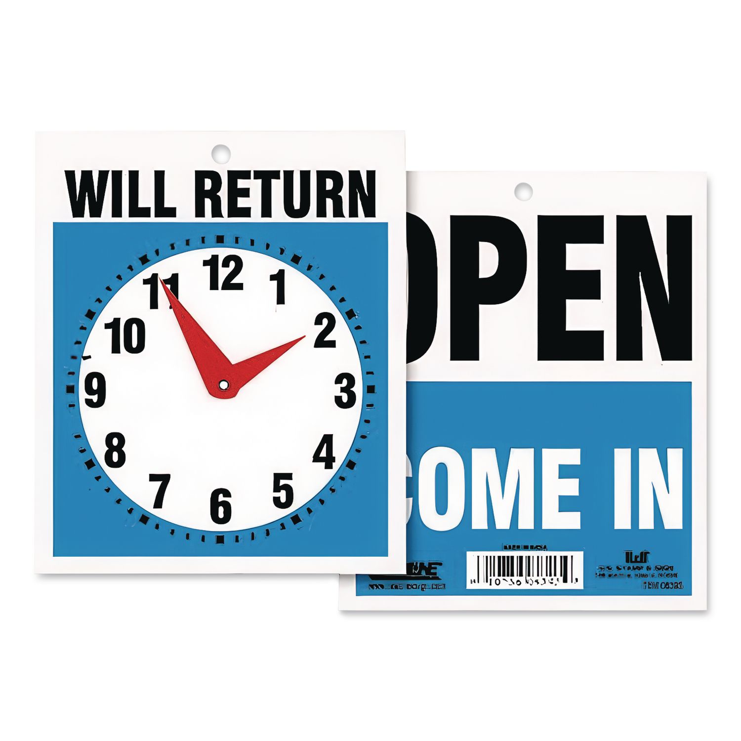 One side announces “Open” and welcomes with “Come In.” Reverse side promises “Will Return” and shows clock time of return. For indoor or outdoor use. Frame Color: Blue/White; Size: 7.5 x 9; Message(s): Come In; Open; Will Return; Material(s): Thick Plastic.