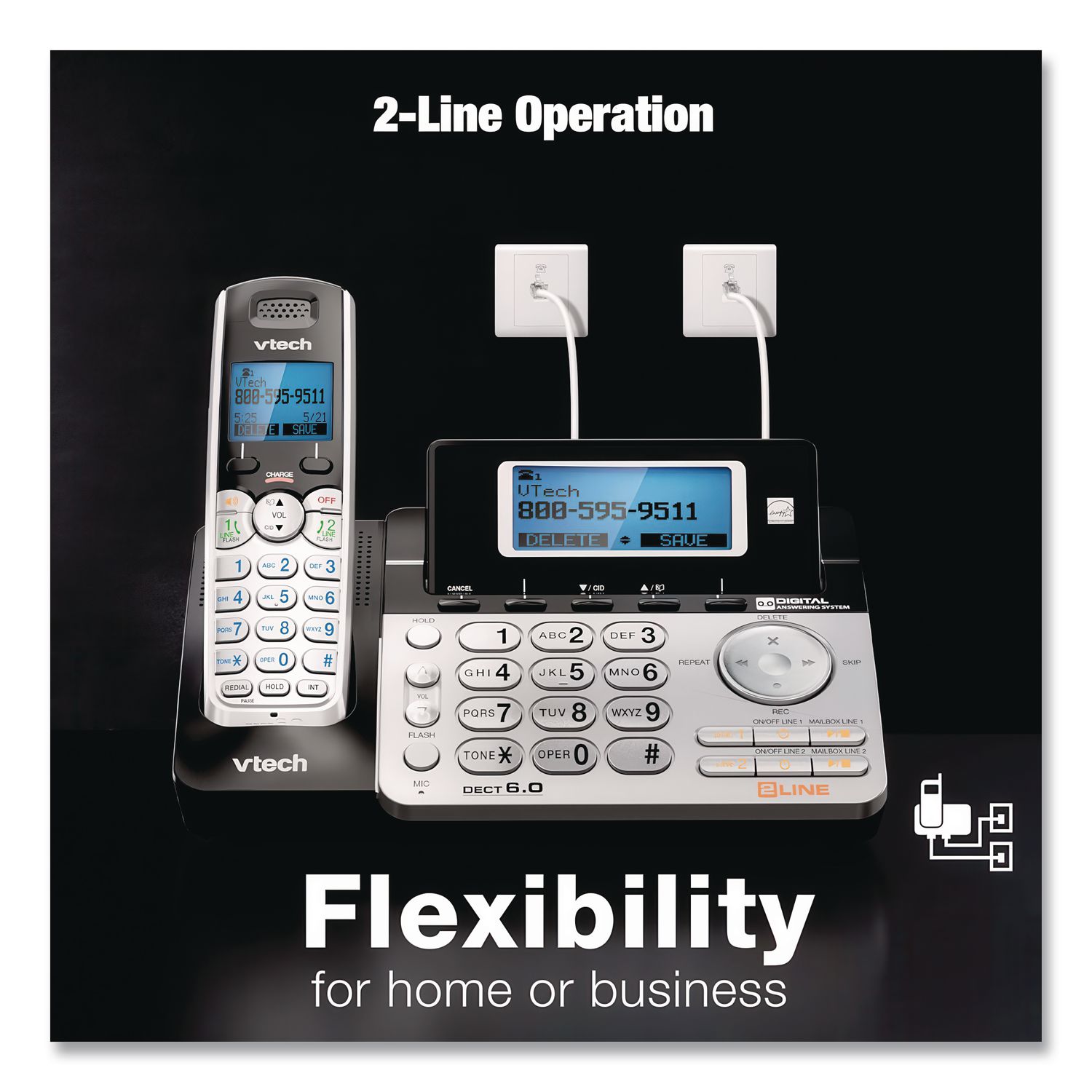 Expandable phone system lets you add handsets where you need them. Two-line operation is ideal for busy homes or small offices. Integrated answering system features voicemail boxes for each line. Handset and base speakerphone provide hands-free options. Answering System: Digital; Lines: 2; Telephone Type: Cordless; Caller ID/Type: Base; Handset.