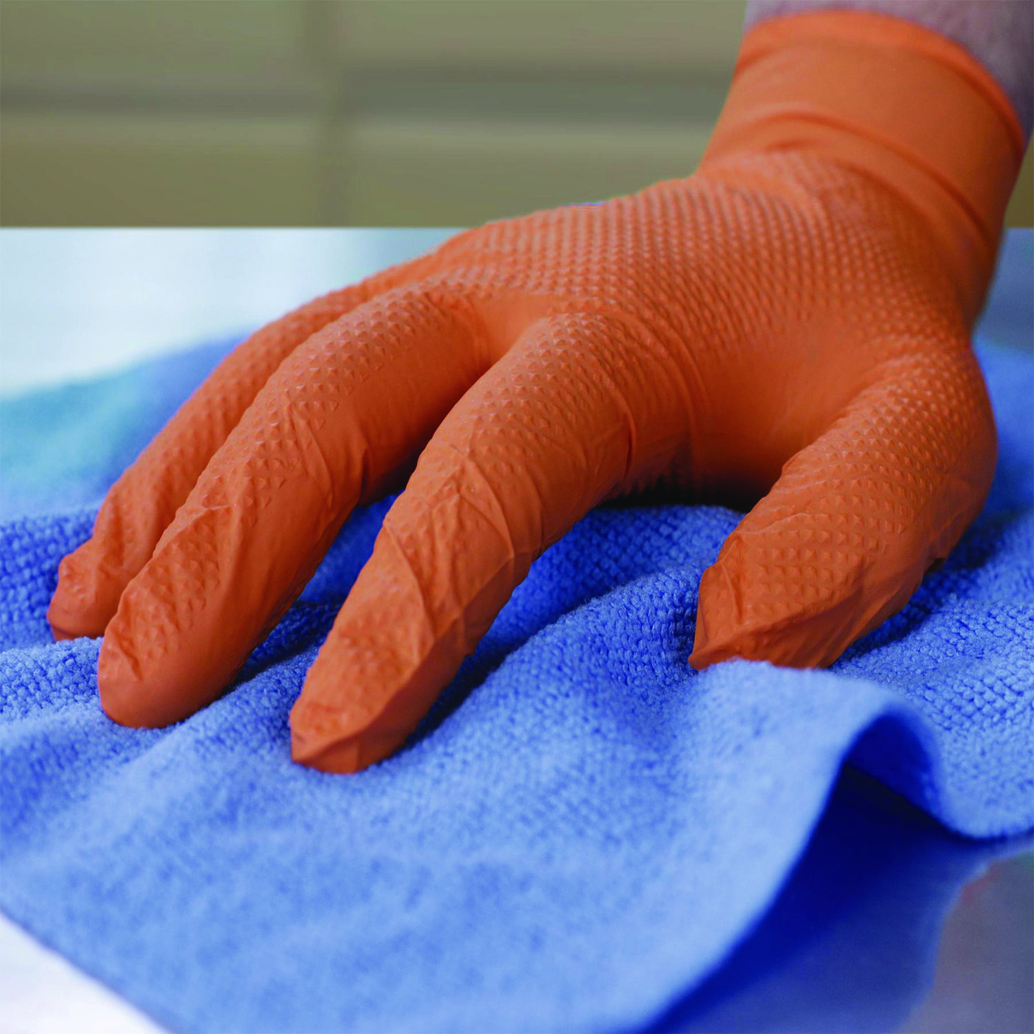 Xtreme by AMMEX® DT Industrial Nitrile Disposable Gloves are diamond textured for an enhanced grip on tools and machinery. Their hi-vis orange color stands out in dark environments to keep hands in plain sight. At 6 mils thick, Xtreme gloves resist punctures as well as permeation by chemicals. They are good for a variety of uses, from automotive to food processing, janitorial/sanitation to manufacturing and more. Glove Material: Nitrile; Packaged Sterile: No; Size Type: Medium; Length: 9.5″.