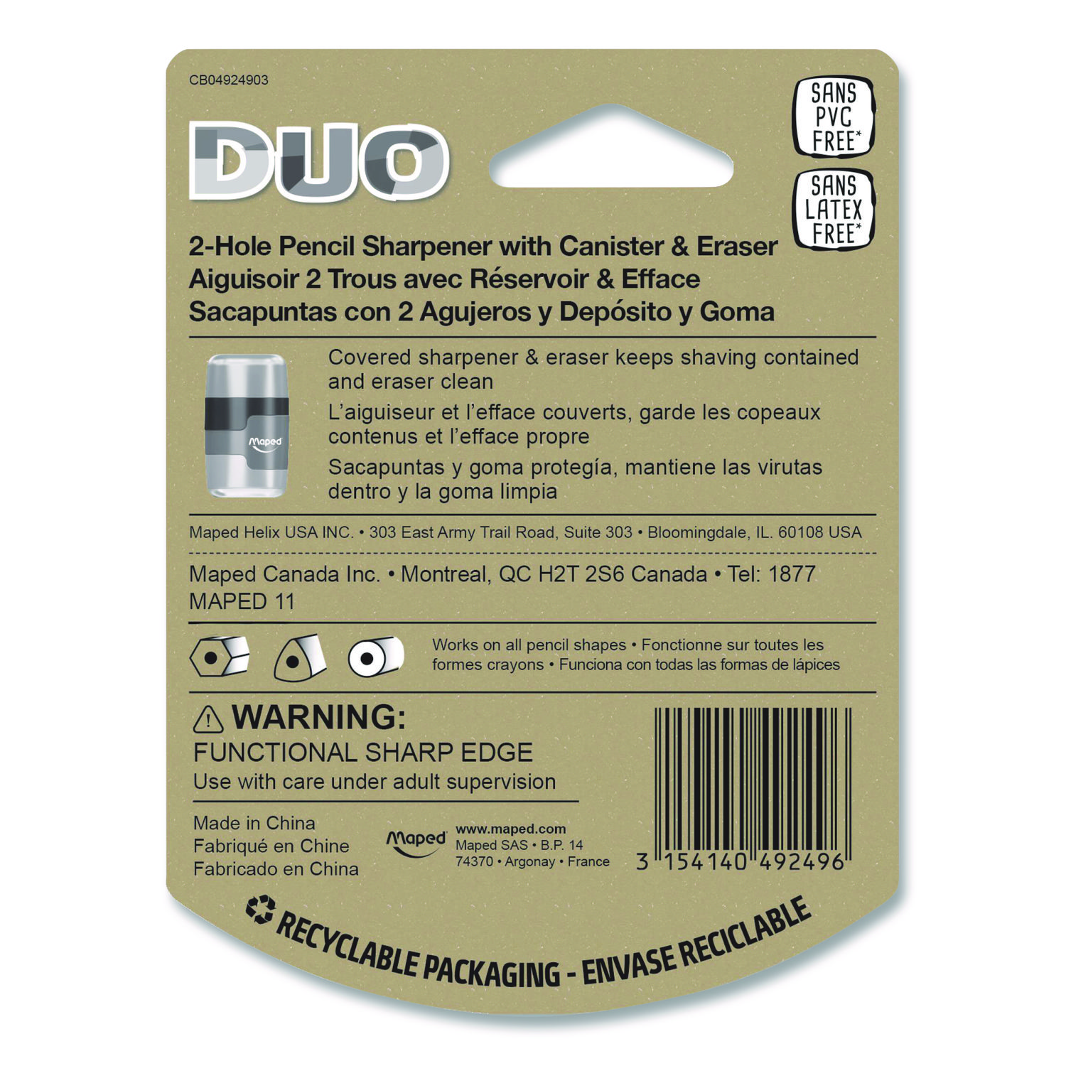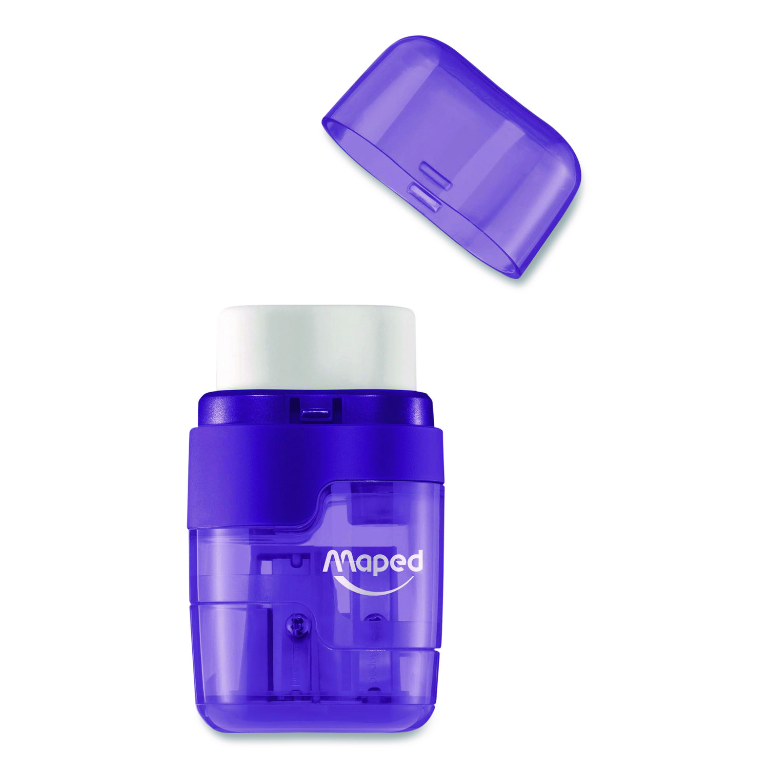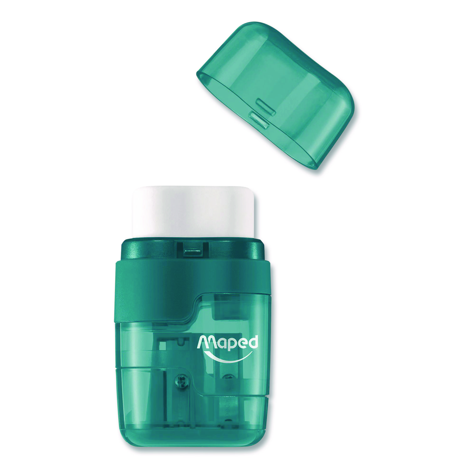 The Maped DUO 2-Hole Canister Pencil Sharpener/Eraser Combo easily separates into two pieces—mix and match the colors to create your own! Remove the top cover to find a super-soft eraser, and flip open the bottom cap to access the 2-hole pencil sharpener for standard and jumbo sized pencils! With a body made of shatter-resistant, transparent plastic it’s always each to tell when you need to empty the shavings canister. Eraser is latex, PVC and phthalate free. Sharpener Type: Manual; Power Type: Manual; Batteries Required: No; Intended-Use Environment: General Use; Home; Office; School.