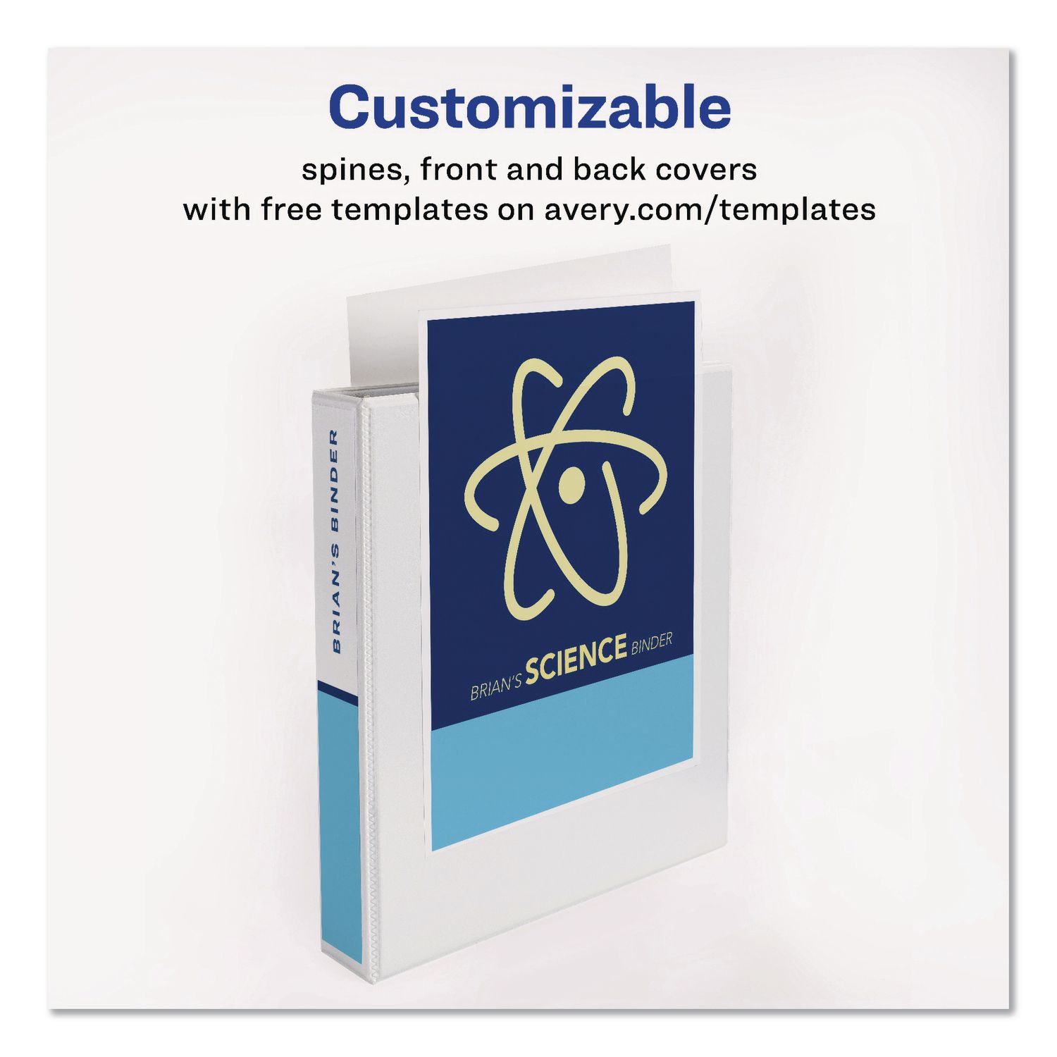 View Binder with EZD® rings was designed with a purpose—to hold more pages in less space. EZD® rings provide an increased capacity when compared to the same size slant or round rings. Tear-resistant DuraHinge® design is stronger and lasts longer. DuraEdge® feature makes the sides and top more pliable, providing greater split resistance. Deeply textured film offers a smoother finish and features a linen pattern for a high-quality look and feel. Durable construction is ideal for frequent referencing. Organize and secure papers within four interior pockets. Pages lie flat with back-mounted rings. Sturdy construction and clever design set a new standard in binder performance. Customize your binder with free templates and designs at Avery® Design & Print Online. Binder Type: Ring; Binder Style: View; Binder Size Capacity: 1.5″; Binder Sheet Capacity: 400.