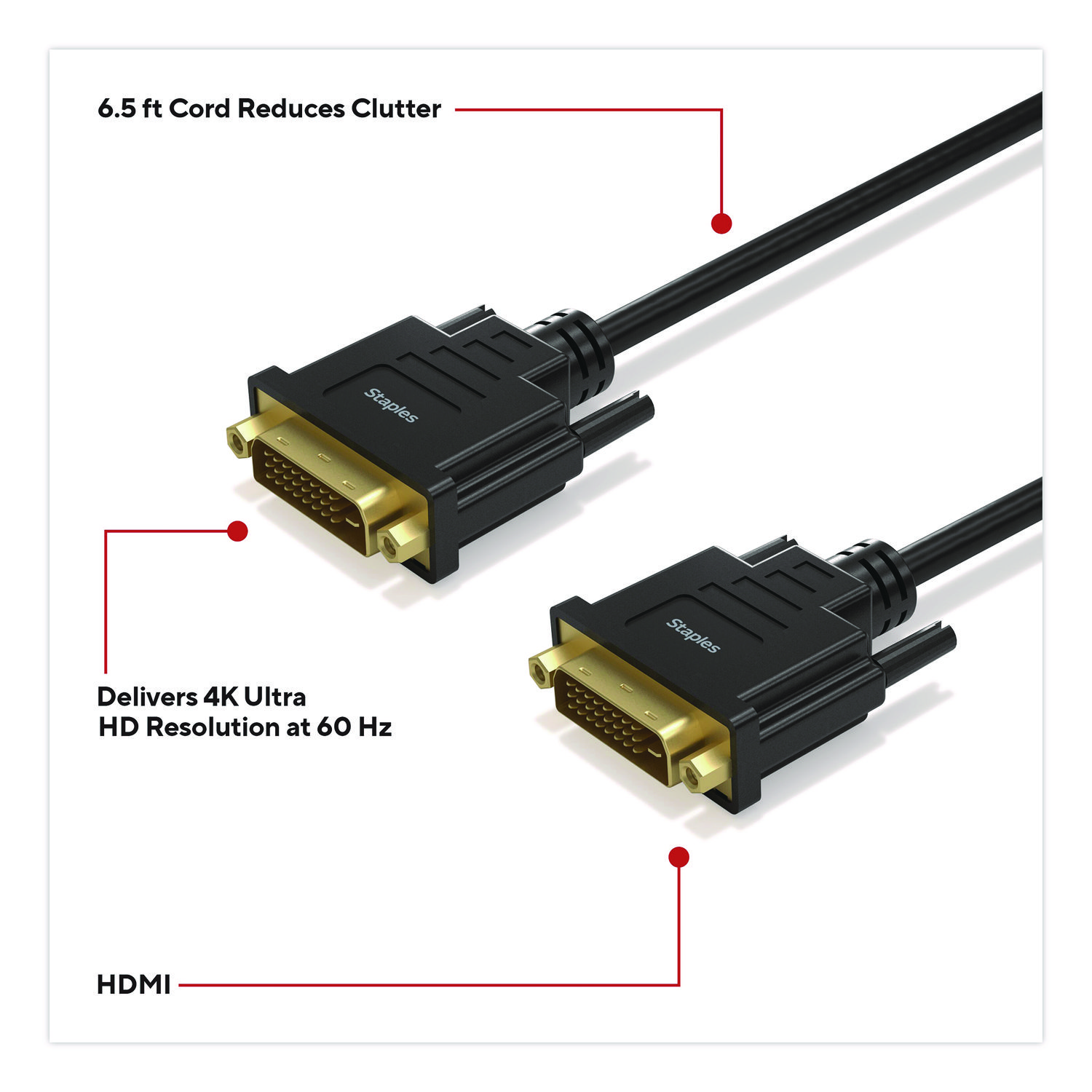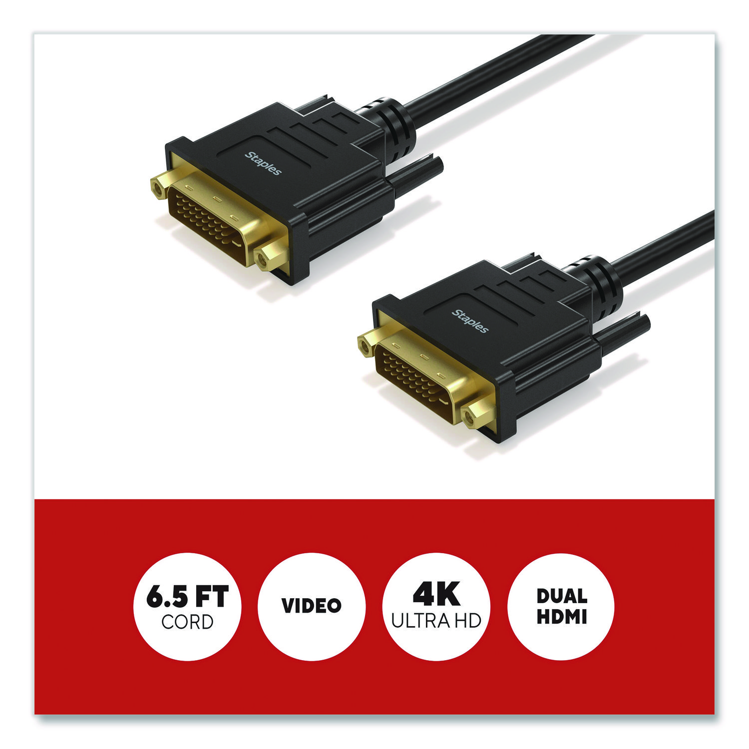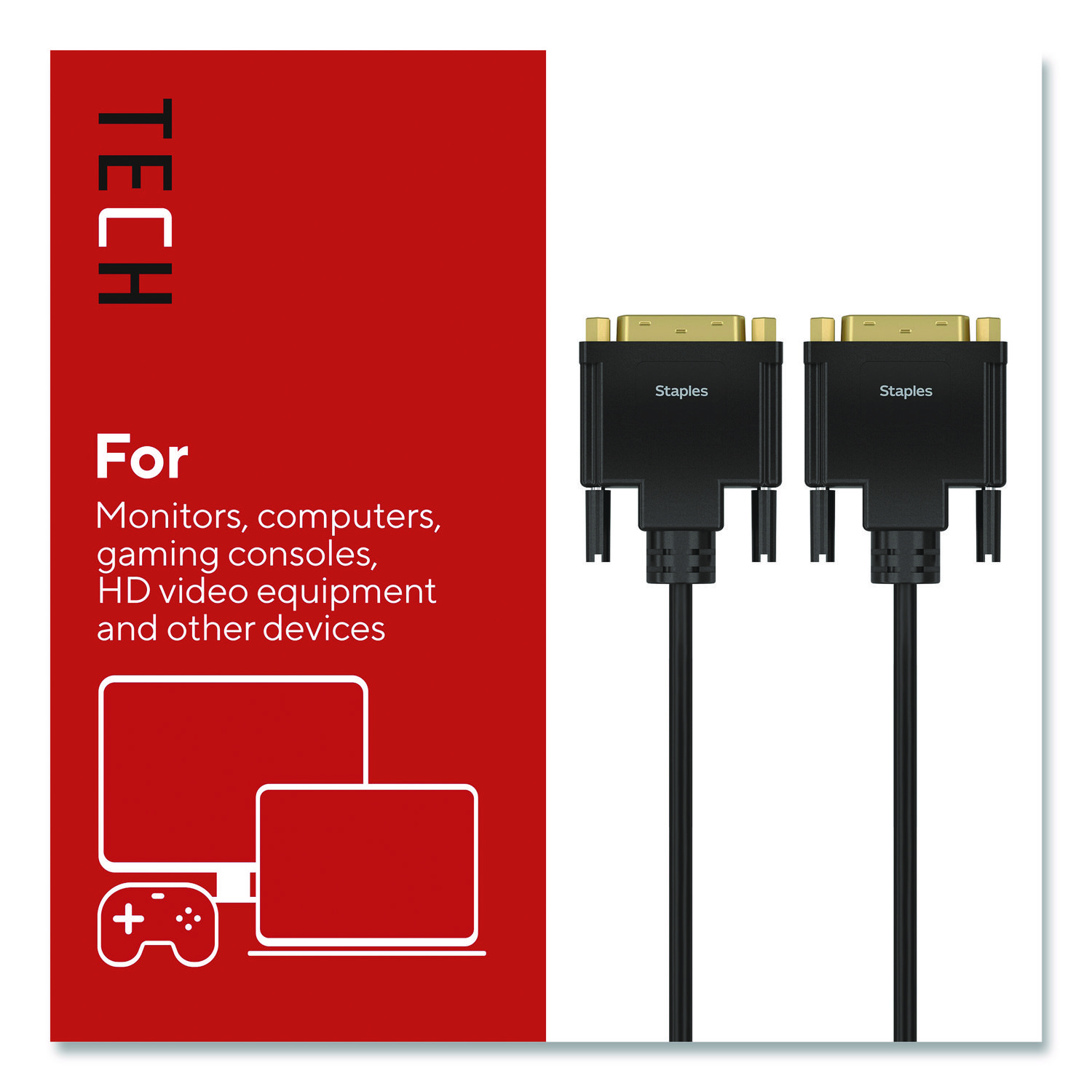For work or entertainment an extra, larger display often comes in handy. With the Staples TECH DVI cable, you can connect additional monitors, displays, gaming consoles, projectors and more. Delivering clear 1080 pixel resolution, this cable promises clear video for an exceptional experience. It provides ample length to connect devices across your work space while also reducing cord clutter. This cable is the perfect choice for outfitting your work, gaming or entertainment space. Enjoy quality video so you can upgrade your home or office workspace and do your best work. Cable Type: DVI-D Cable; Connector/Port/Interface: DVI-D Male; DVI-D Male; Cable Length: 6.5 ft; Jacket Color: Black.