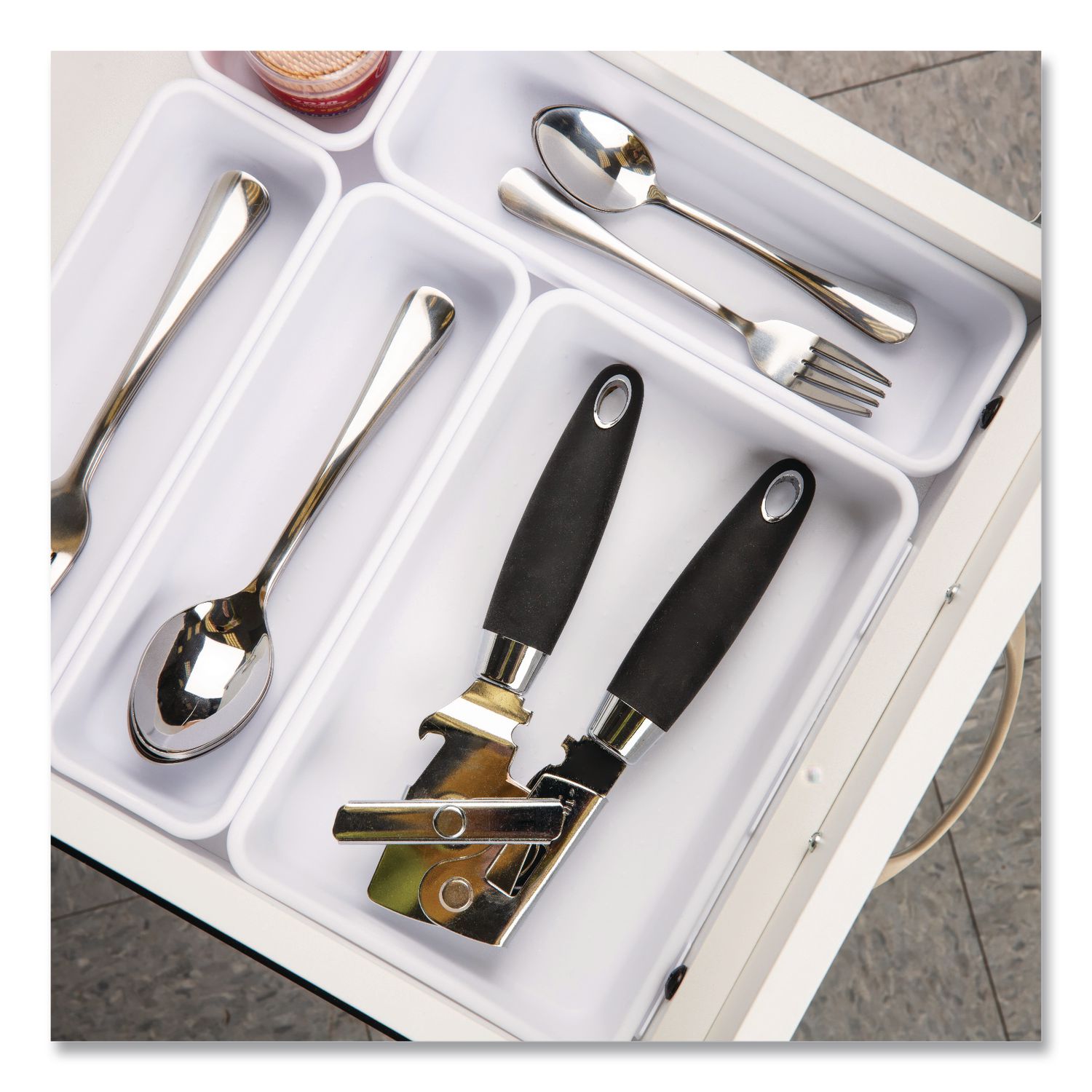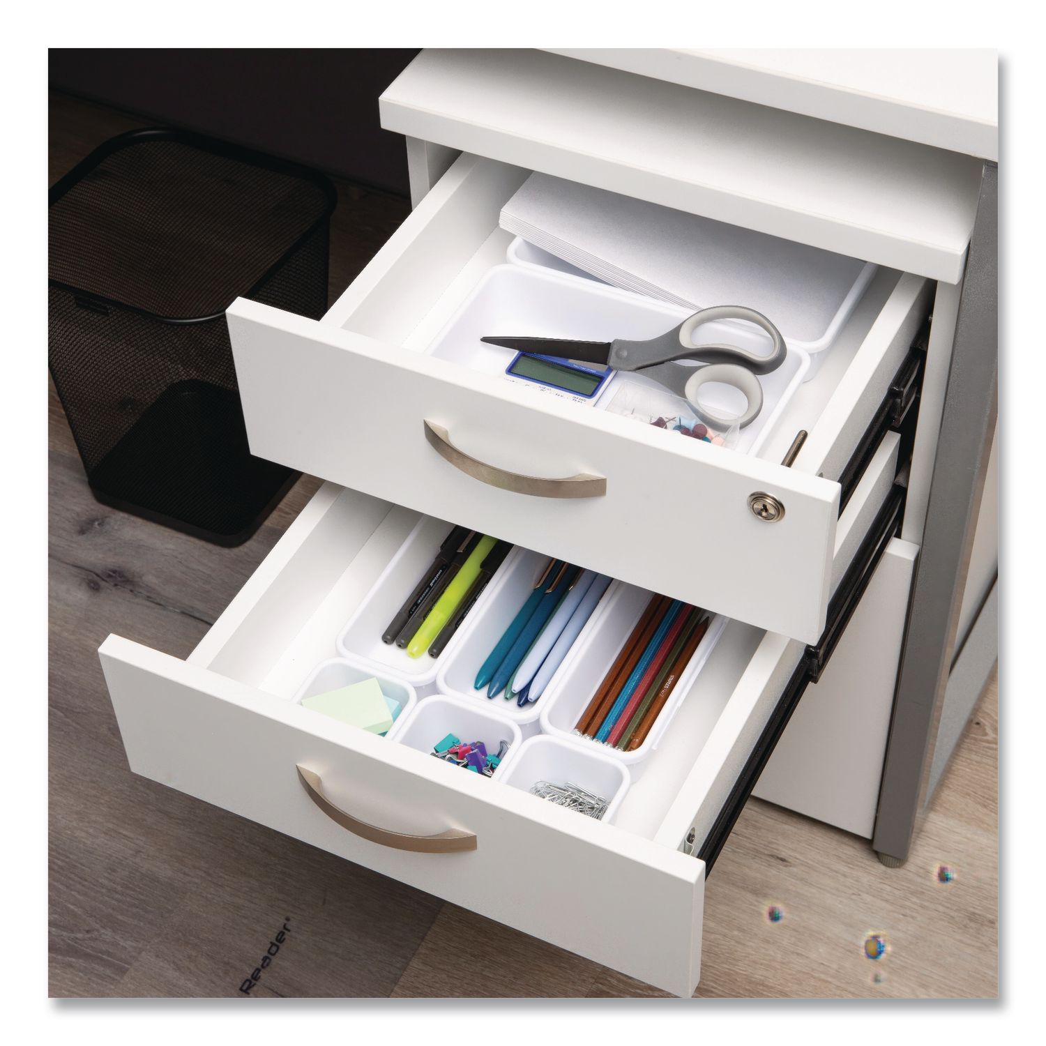 This eight-piece small storage bin set is a perfect solution to tidying up various spaces, from drawers and desks to kitchen counters and vanity tables. Ideal for a range of items, the bins provide a neat and orderly space for jewelry and makeup, small toys and hobby pieces, or even kitchen items like sugar packets, creamer and straws. Transform your junk drawer into a tidy haven with these eight interlocking bins. One of the key features of this set is its adaptability. The bins, in three sizes, can interlock with one another, providing a flexible storage solution that can be rearranged to fit various drawers, shelves or surfaces. They can click together on each side and are also stackable, enabling you to optimize storage space, especially in deeper drawers. Whether you are a crafter, a beauty enthusiast, a student or a hobbyist, the storage bin set is an excellent addition to your space. College students will appreciate their compact size, making them a perfect fit for limited dorm spaces. For those seeking to declutter their office desk or home workspace, these bins are a game-changer. Compartments: 8; Adjustable: Yes; Color(s): White; Material(s): Plastic.