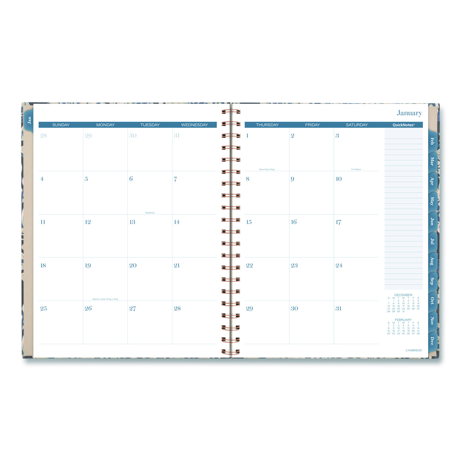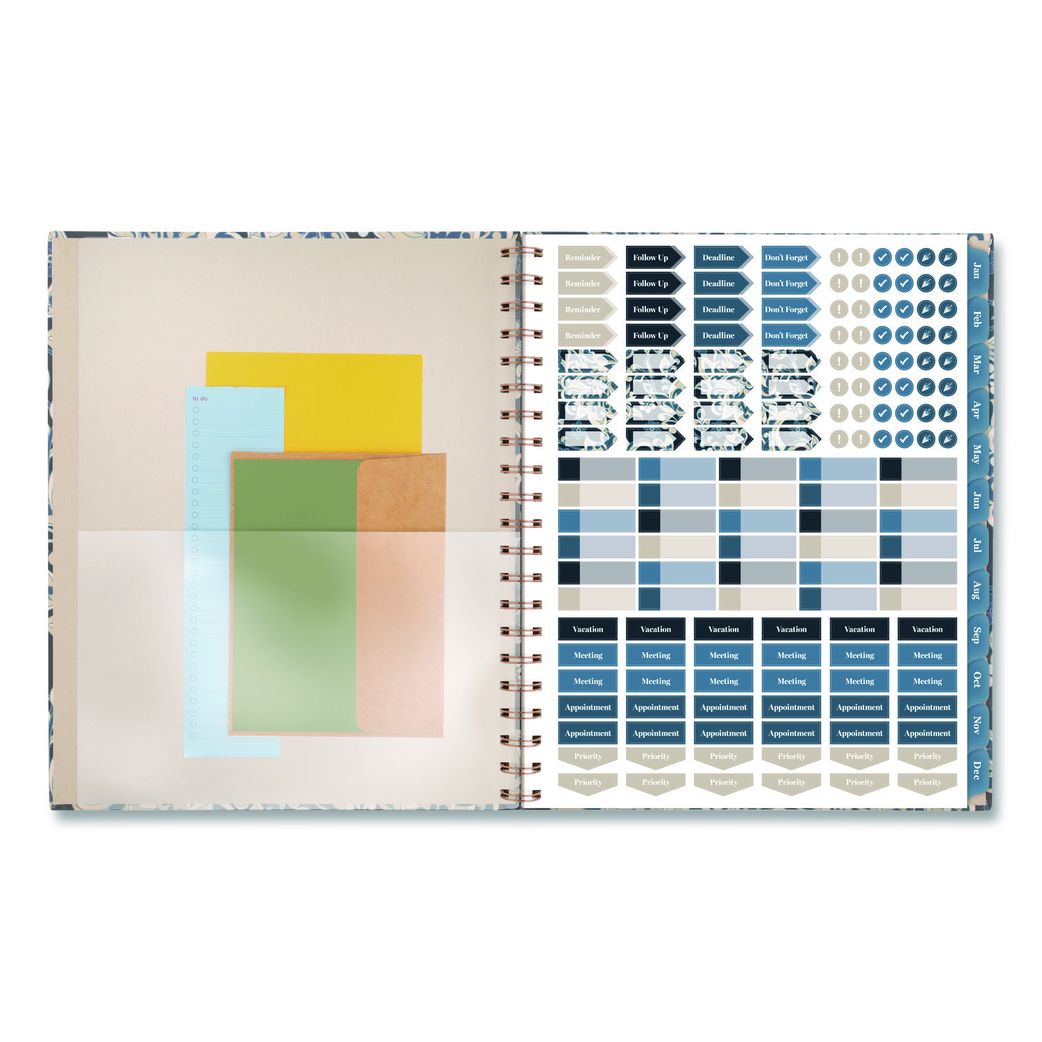 Bring elegance and structure to your plans this year when you use the Cambridge Elizabeth Weekly Monthly Planner. The blue and white floral pattern brings timeless style to your planning. Start fresh each week. Open daily sections and a small QuickNotes® area help you stay on track all year long. See how much you can accomplish in one month! The tabbed monthly pages help you see your big picture plans in an instant. Who doesn’t love extras? Special pages include a double-sided poly pocket, three-year reference calendar, holiday list and others. The durable hardcover helps the planner stand up to wear and tear no matter where your day takes you. Our twin wire binding helps keep your pages secure and won’t snag on your bag or clothing. Dated: Yes; Academic Year: No; Calendar Format: Weekly/Monthly; Calendar Spread Format: One Week per Two-Page Spread; One Month per Two-Page Spread.