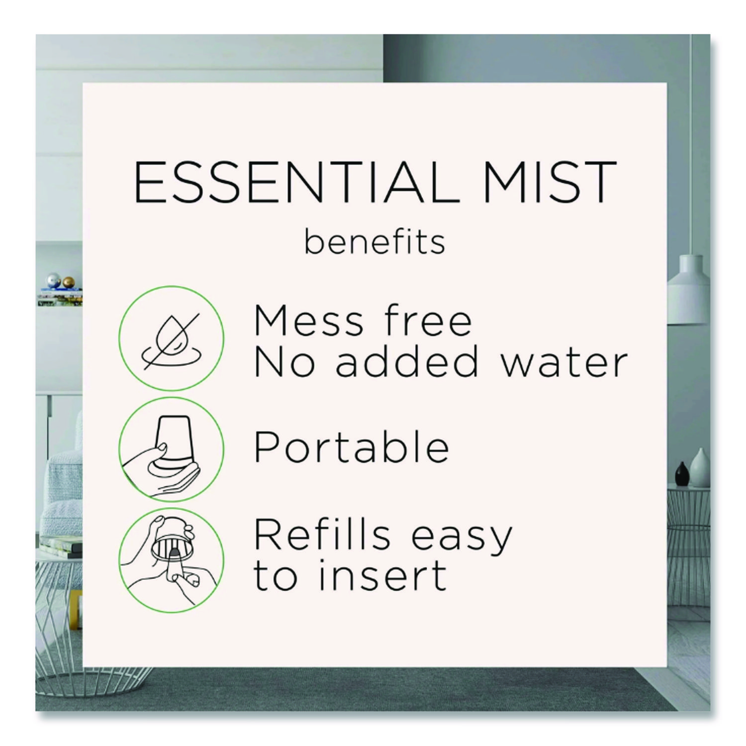 Contains natural essential oils. No water needed as oil diffuses into a mist through microscopic holes in the vibrating plate. Each refill lasts up to 45 days on the lowest intensity setting. For use in Air Wick Essential Mist Diffusers. Three intensity settings for ultimate fragrance control. Scent: Linen & Petals; Physical Form: Liquid; Application: Automatic Odor Control; Volume Capacity: 0.67 oz.