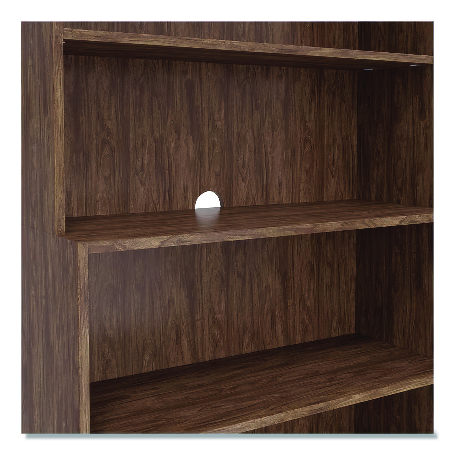 Boost productivity through increased organization. Sharp lines bring contemporary styling to your office. Adjustable shelving lets you create a customized setup. Cable management grommet keeps cords and wires out of sight, making this bookcase great for a phone, fax or other office electronics. Includes wall attachment hardware for safety. Five Shelves—Three Adjustable. Color(s): Espresso; Color Family: Brown; Material(s): Laminate; Number of Shelves: 5.