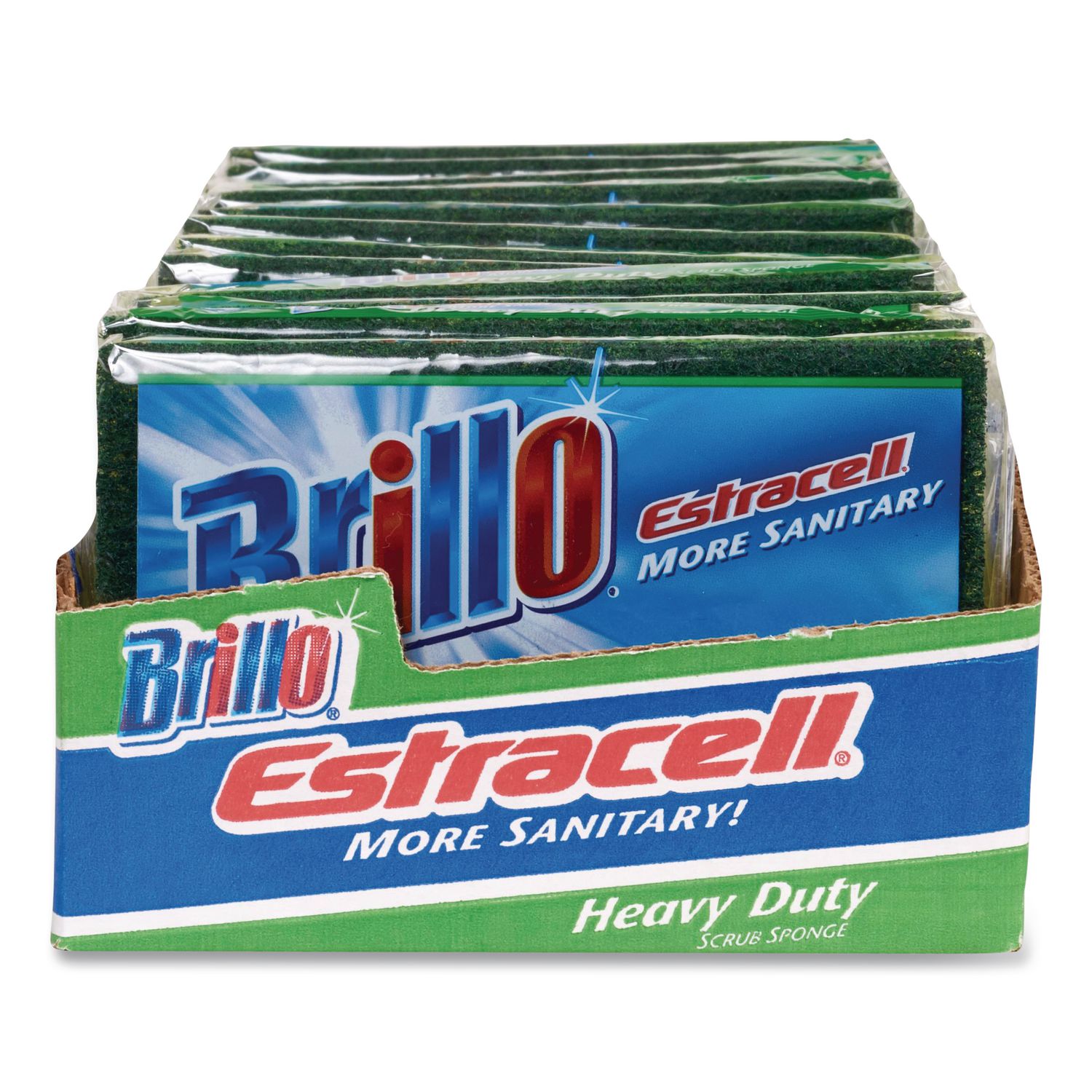The more sanitary, dual-sided Brillo® Estracell® Heavy Duty Scrub Sponge easily removes burnt-on foods. It’s made with unique fibers that dry faster, and rinse 10x faster than other sponges, too. Use a different sponge for all your surfaces, so you can clean up without spreading bacteria around. This, plus the fact that bacteria won’t grow on our Estracell® sponges, makes them more sanitary. That’s why Brillo® is one of the most trusted names in household cleaning. Sponge Type: Scrub Pad; Material(s): Estracell; Shape: Rectangular; Width: 4.9″.