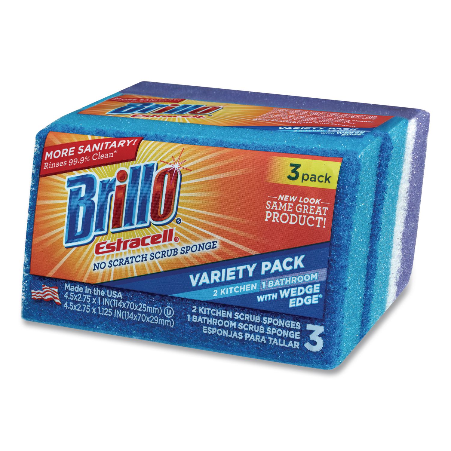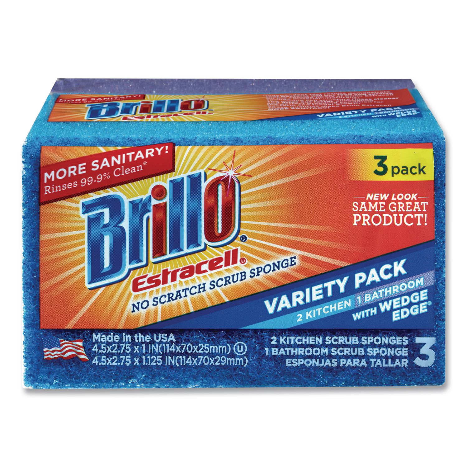 Brillo® Estracell® kitchen sponges are designed with unique fibers that dry faster, and rinse 10x faster than other sponges. Use a different sponge for each of your surfaces, so you can clean up without spreading bacteria around. This, plus the fact that bacteria won’t grow on our Estracell® sponges, makes them more sanitary. Sponge Type: Scrub Sponge; Material(s): Polyester; Shape: Rectangular; Width: 4.5″.