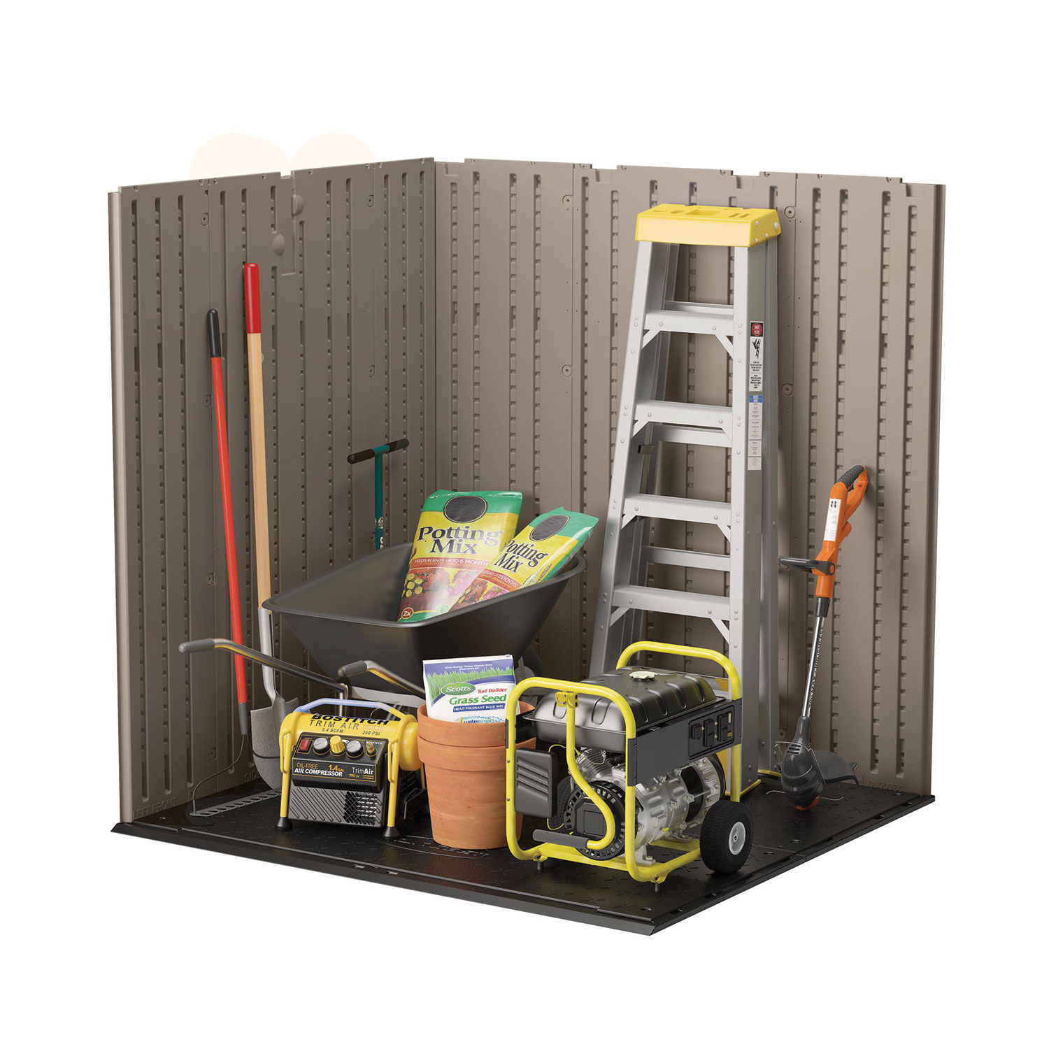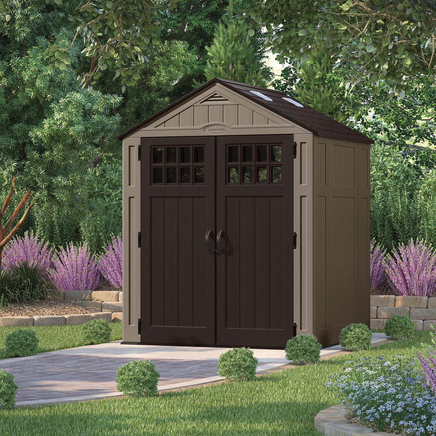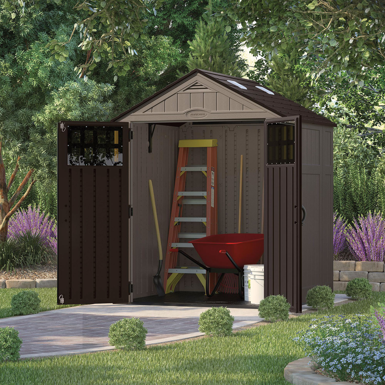 From yard tools to lawn mowers, this 201 cu ft Everett storage shed by Suncast is perfect for storing away all of your outdoor equipment. Large double-door entryway provides easy access to your belongings and is equipped with pad-lockable resin handles for security (lock not included). The reinforced resin floor is built to withstand heavy loads and can handle a wide range of items. Built-in skylights and large door windows light up the space on a sunny day. Constructed of metal-reinforced, multi-wall resin panels, this attractive shed can withstand the elements while looking great in your yard all year long. Color(s): Dark Taupe/Black/Slate; Interior Volume Capacity: 201 cu ft; Material(s): Plastic; Overall Outer Width: 6 ft 2.75″.