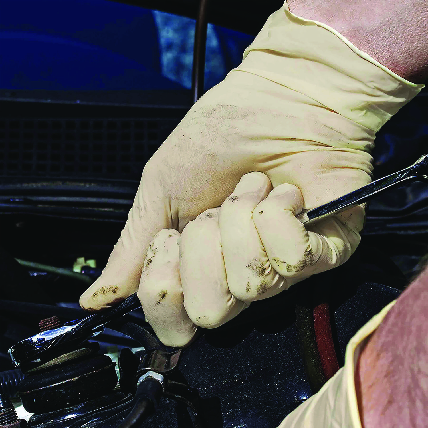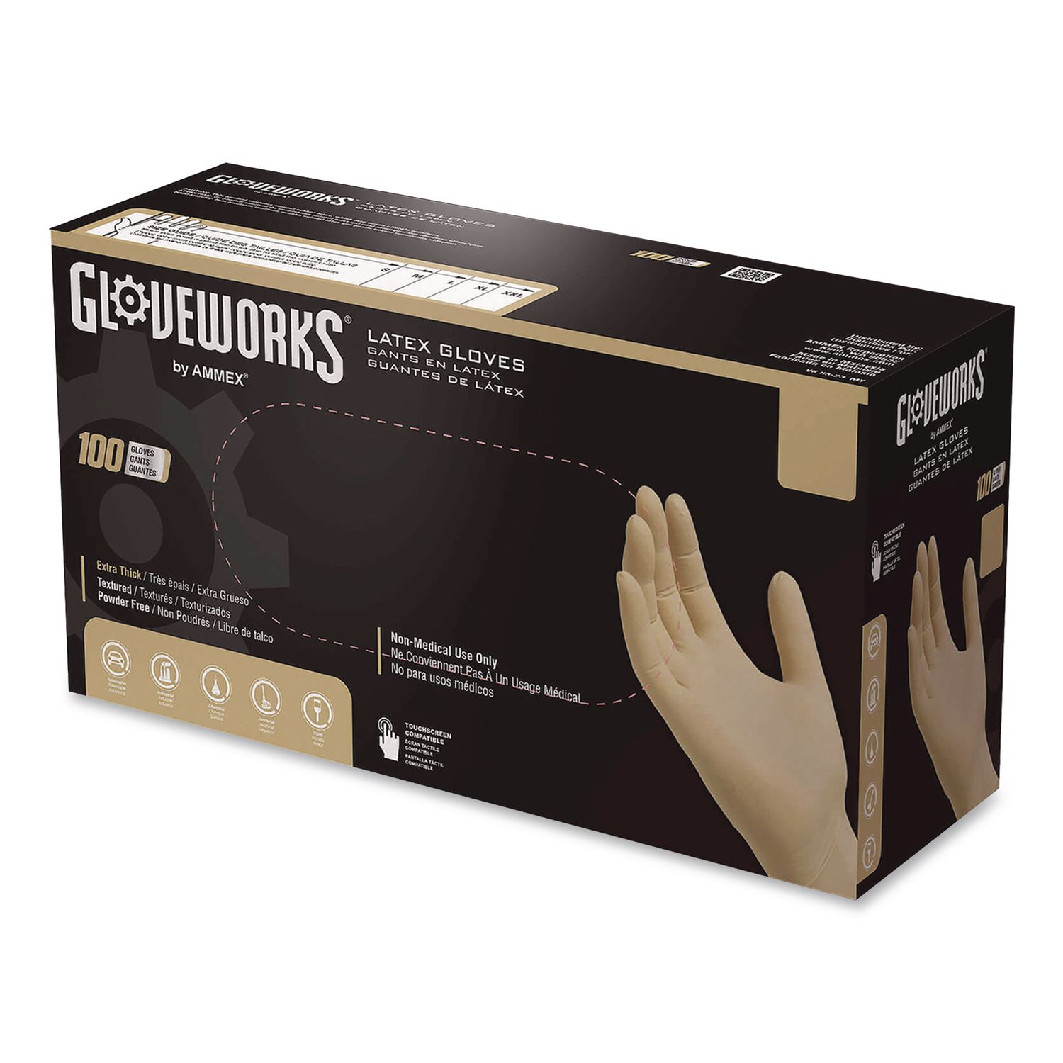 Gloveworks by Ammex Latex Disposable Gloves deliver the right combination of strength, durability, comfort and fit. They are thick enough to protect your hands, yet they provide touch sensitivity with a texture that enhances grip. Extra Thick. Glove Material: Latex; Packaged Sterile: No; Size Type: Medium; Length: 9.5″.