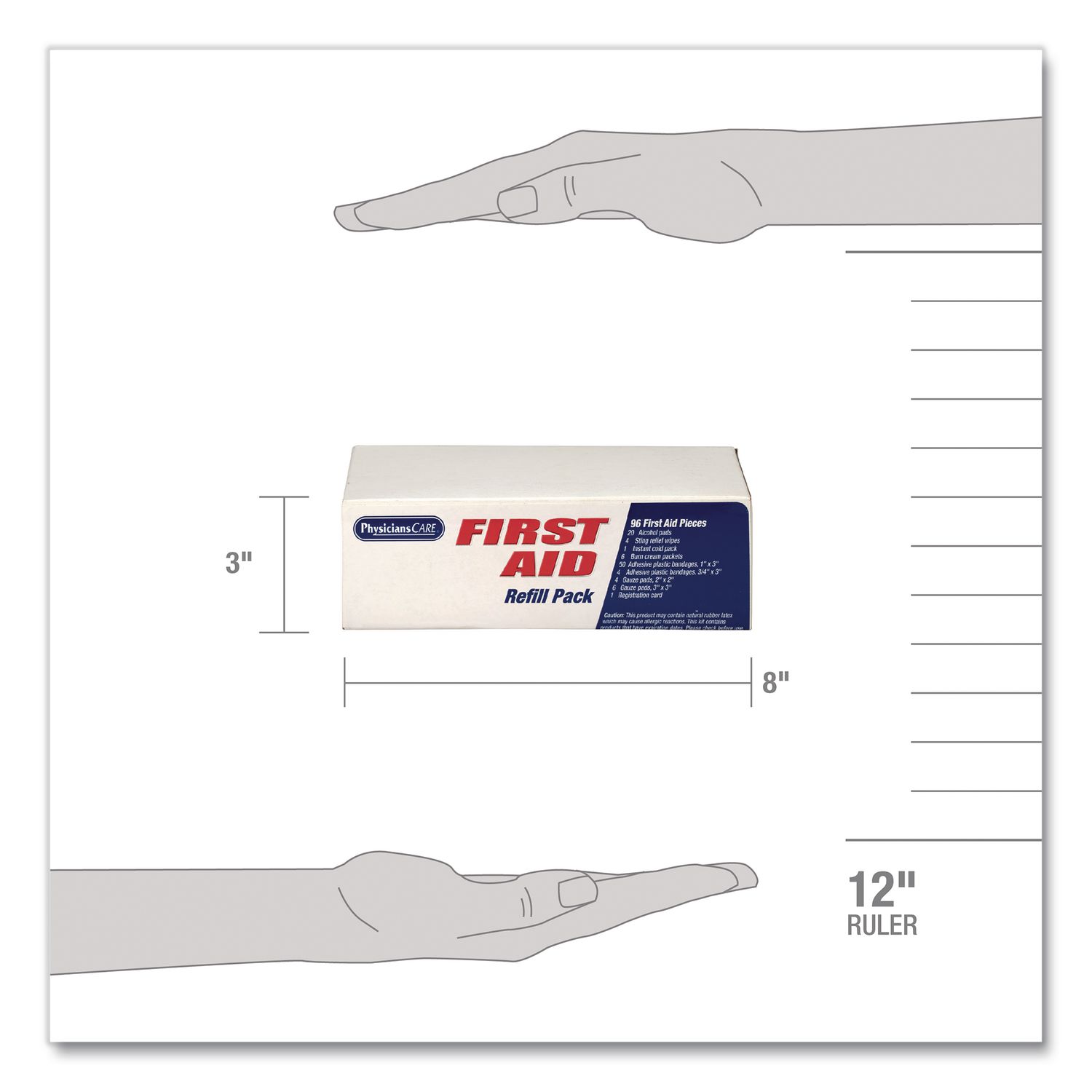 This First Aid Refill Kit includes the most frequently used first aid products. Number of Pieces: 96; Length: 8″.