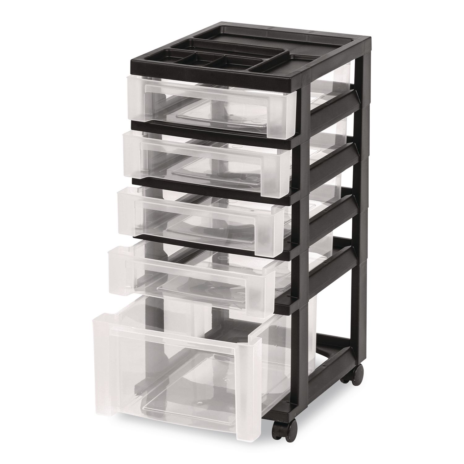 Contain clutter in your office or cubicle with this five-drawer organizer. The clear construction lets you see the items stored inside each of the five drawers, while dual-wheel casters make it easy to move this storage cart throughout your workspace. Features multiple compartments on top, so you can sort paper clips, staplers and other smaller items for easy access as you work. Material(s): Polypropylene; Overall Material Type: Plastic; Color(s): Clear/Black; Color Family: Clear.