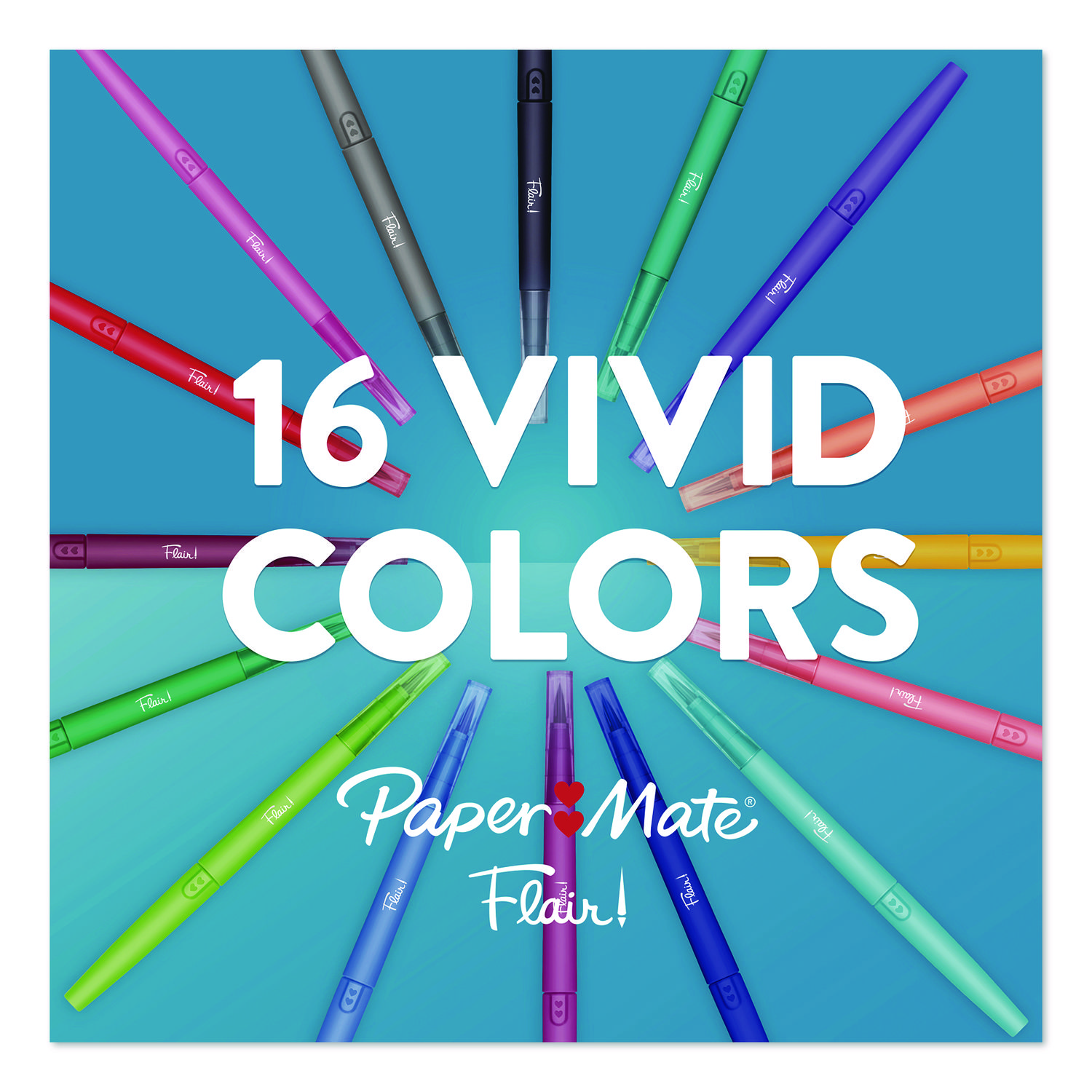 Double your creativity with Paper Mate® Flair Dual Pens! Dual-ended pens add an extra dimension to your note-taking, journaling, hand-lettering and more! On one end, a flexible brush tip helps you create a variety of line widths simply by changing pressure as you go. On the other end, a felt tip is perfect for writing and drawing finer, more precise lines. The full range of vivid, colorful inks are also smear-resistant, and the ink is specially formulated to eliminate the potential for bleed-through. Ensure your work looks its best when you choose Flair Dual! Pen Sub-Brand & Product Family: Flair® Dual; Pen Type: Porous Point Pen; Pen Style: Stick; Pen Tip Type: Brush/Bullet.