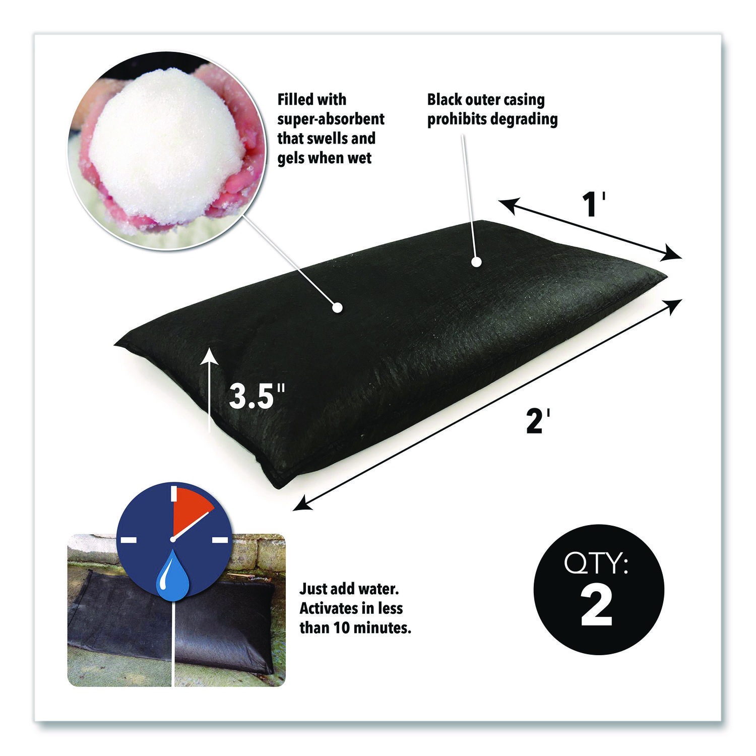 Quick Dam Flood Bags absorb, contain and divert problem flood water. Diameter: 12″; Height: 3.5″; Length: 24″; Width: 12″.