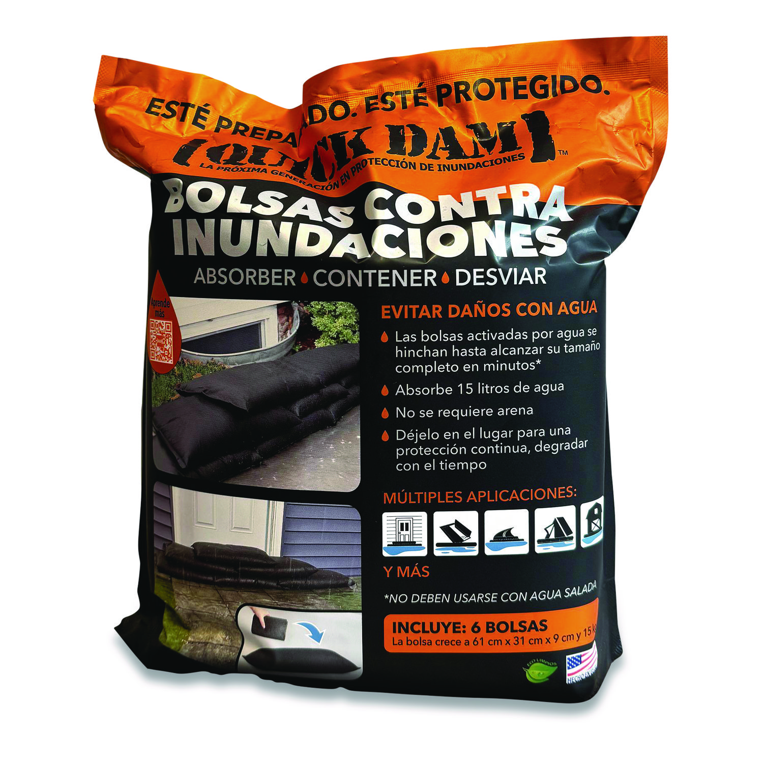 Quick Dam Flood Bags absorb, contain and divert problem flood water. Diameter: 12″; Height: 3.5″; Length: 24″; Width: 12″.