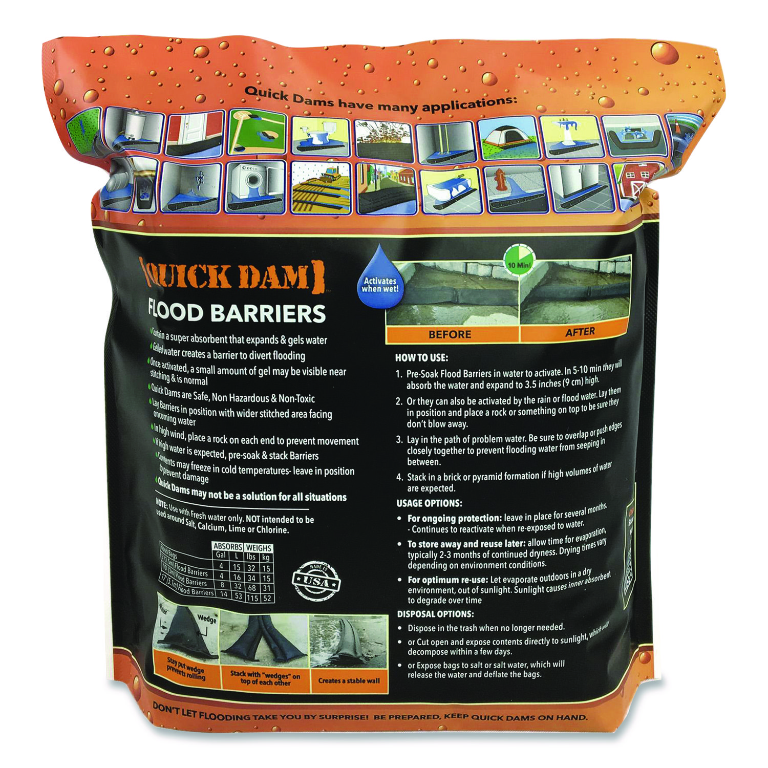 These patented Quick Dam Flood Barriers absorb, contain and divert problem flood water. Diameter: 6″; Height: 3.5″; Length: 10 ft; Width: 6″.