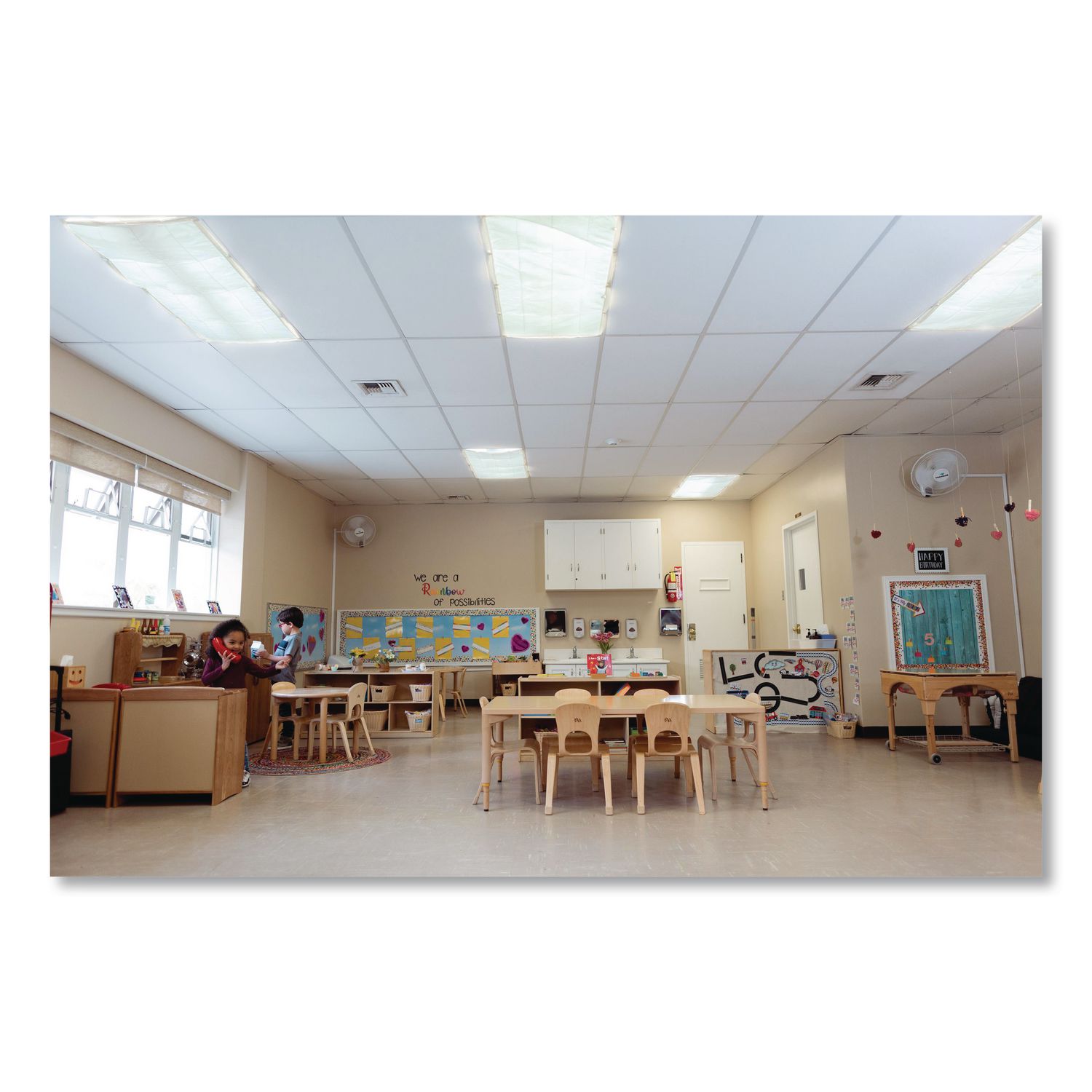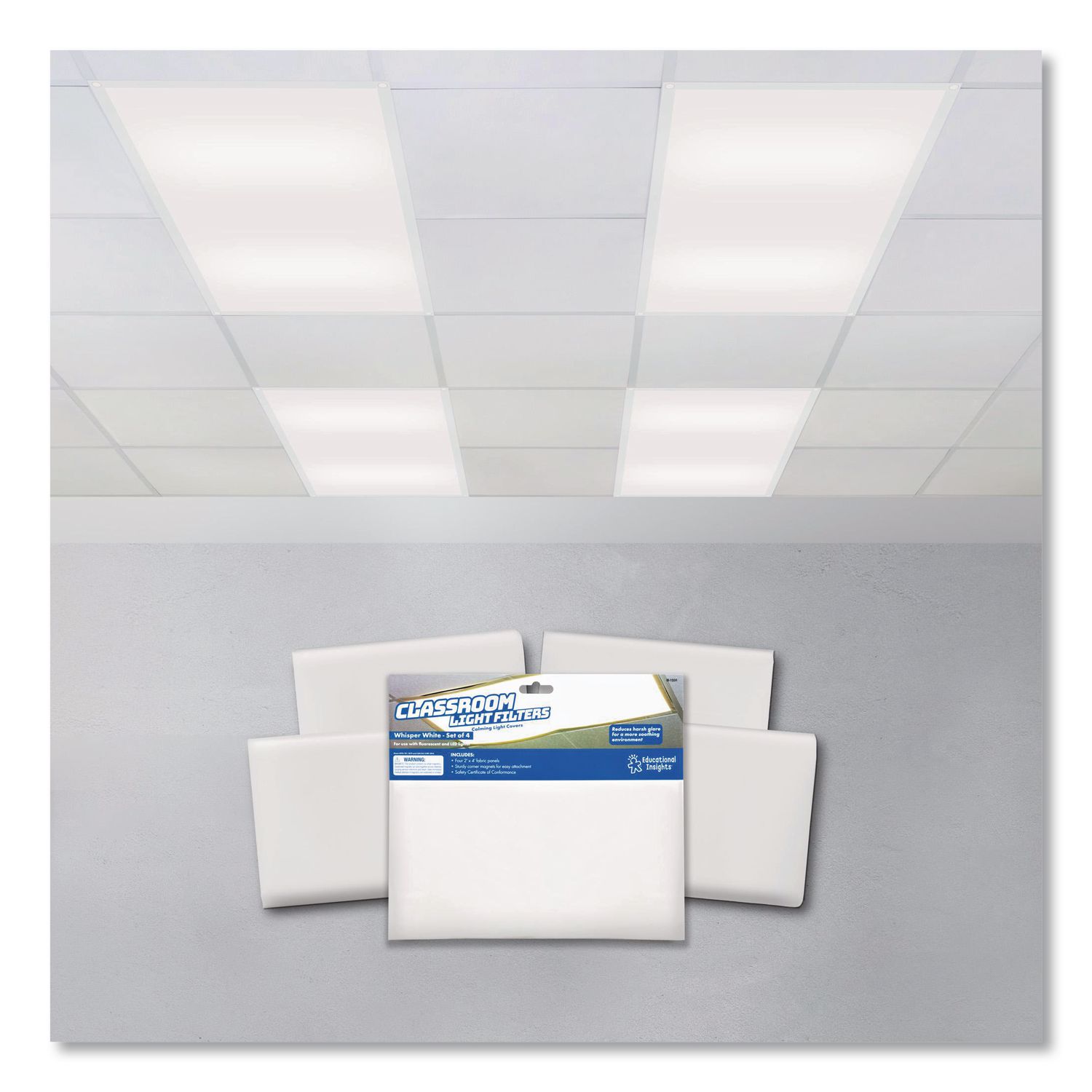 Fluorescent lights are a staple in classrooms, but their harsh glare and flickering light can cause eyestrain, headaches, and anxiety in students. Cover your classroom fluorescent lights with these fabric panels that fit over standard ceiling fixtures with sturdy, sewn-in magnets. Each set includes four heat-resistant panels. For use with fluorescent lights only. Lighting Effect Type: Dimming/Diffusion Filter; Color(s): Whisper White; Color Family: White; Shape: Rectangular.