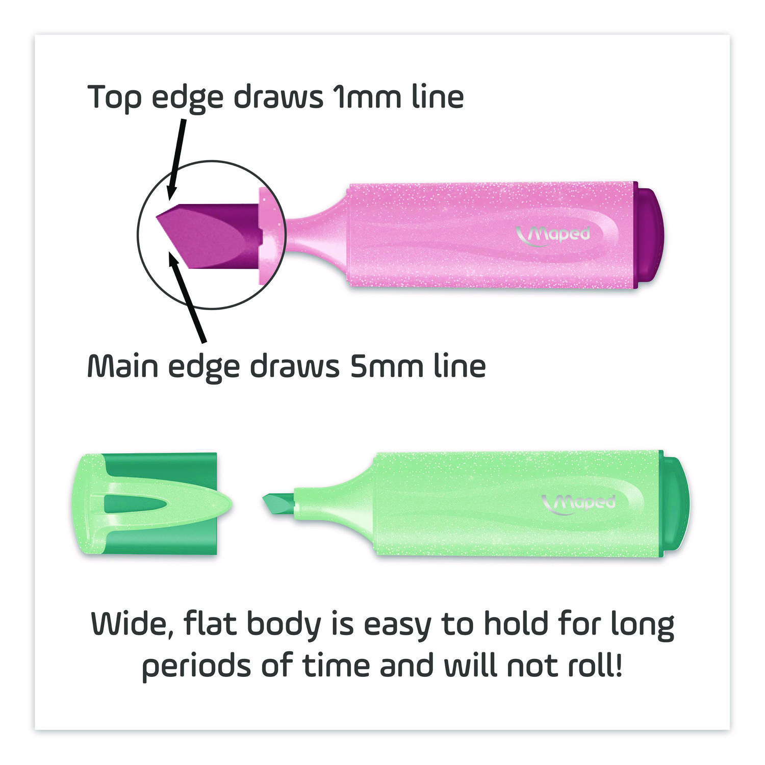 For an even more unique note-taking experience, turn to the brand-new Fluo Pep Classic Pastel Glitter Highlighters! Super fun, sparkly pastel colors really set you apart at school, home or office! Their wide body fits comfortably in your hand and doesn’t roll of your desk, and the super trendy pastel ink really lets you show off your style! The soft, dual-beveled tip easily draws 5 mm or 1 mm lines depending on the side you hold the highlighter, and consistent ink dispensing make this highlighter the right tool for small or large jobs. Safe on all paper, inks, graphite, faxes, ink-jet printing and more! Highlighter Style: Flat Tank; Highlighter Ink Color: Assorted; Color Family: Multicolor; Highlighter Ink Color Assortment: Pastel Glitter Green; Pastel Glitter Pink: Pastel Glitter Purple; Pastel Glitter Teal.