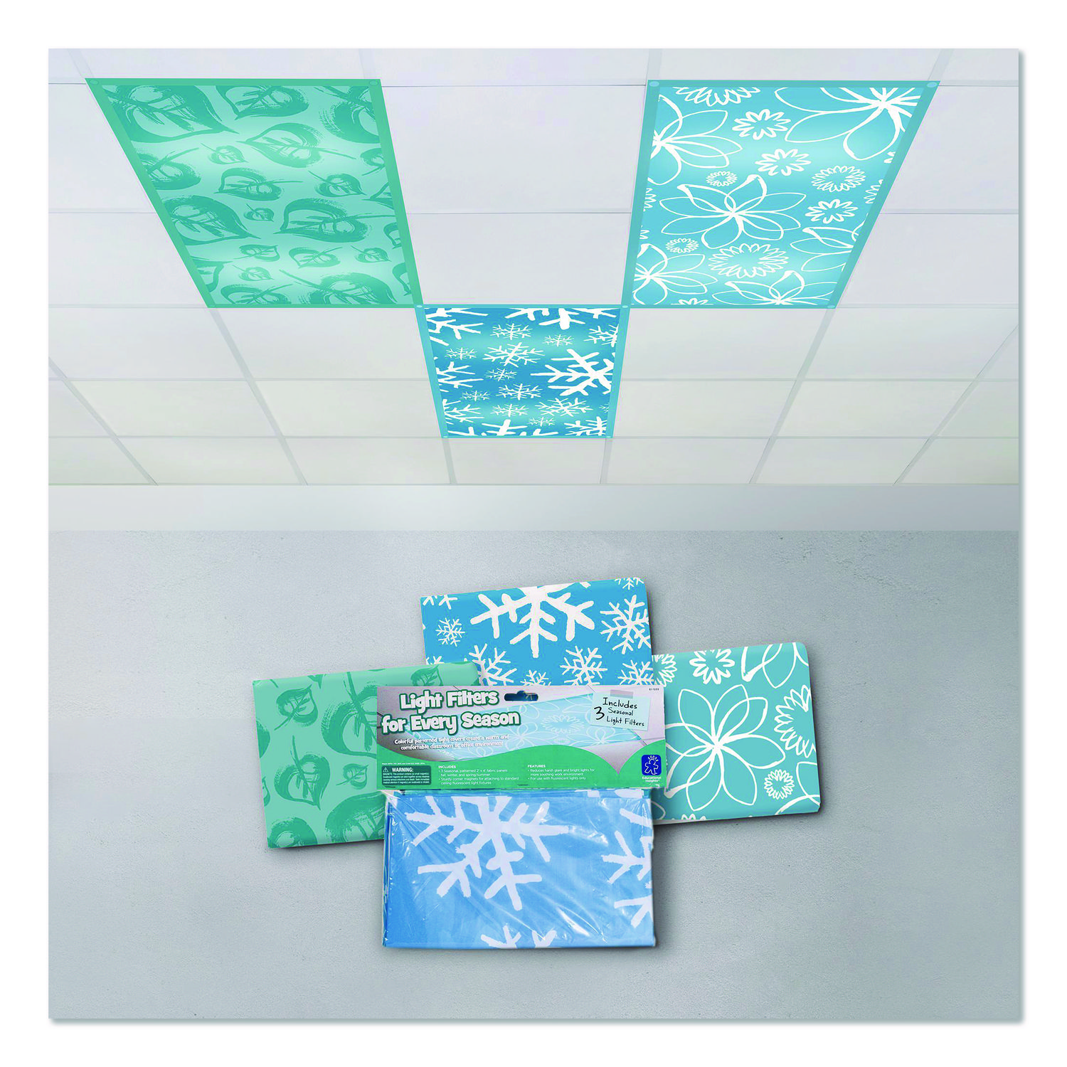Eliminate the harsh, headache-inducing glare and flicker from typical fluorescent lighting with three beautifully designed seasonal light filters representing fall, winter and spring/summer! Each 2 ft x 4 ft panel in this set of three features magnetic corners that attached easily to standard fluorescent ceiling fixtures. Perfect for creating a calming, soothing atmosphere in the classroom or the office. Lighting Effect Type: Dimming/Diffusion Filter; Graphic Design: Seasonal Designs; Color(s): Blue; Color Family: Blue.