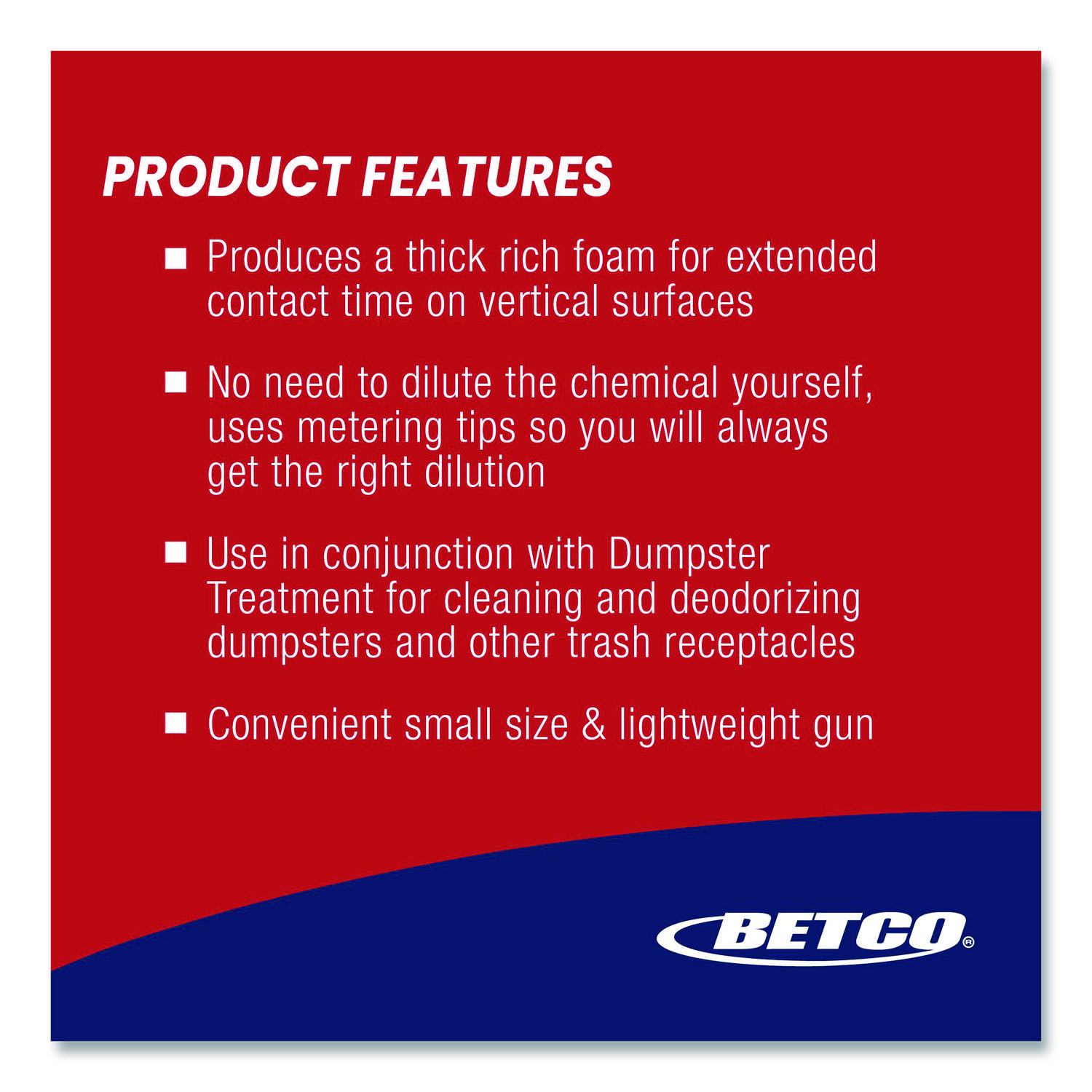 Produces a thick rich foam for extended contact time on vertical surfaces. No need to dilute the chemical yourself, uses metering tips so you will always get the right dilution. Sprayer/Hose/Nozzle Type: Sprayer; Interior Volume Capacity: 96 oz; For Use With: Garden Hose; Material(s): Plastic.