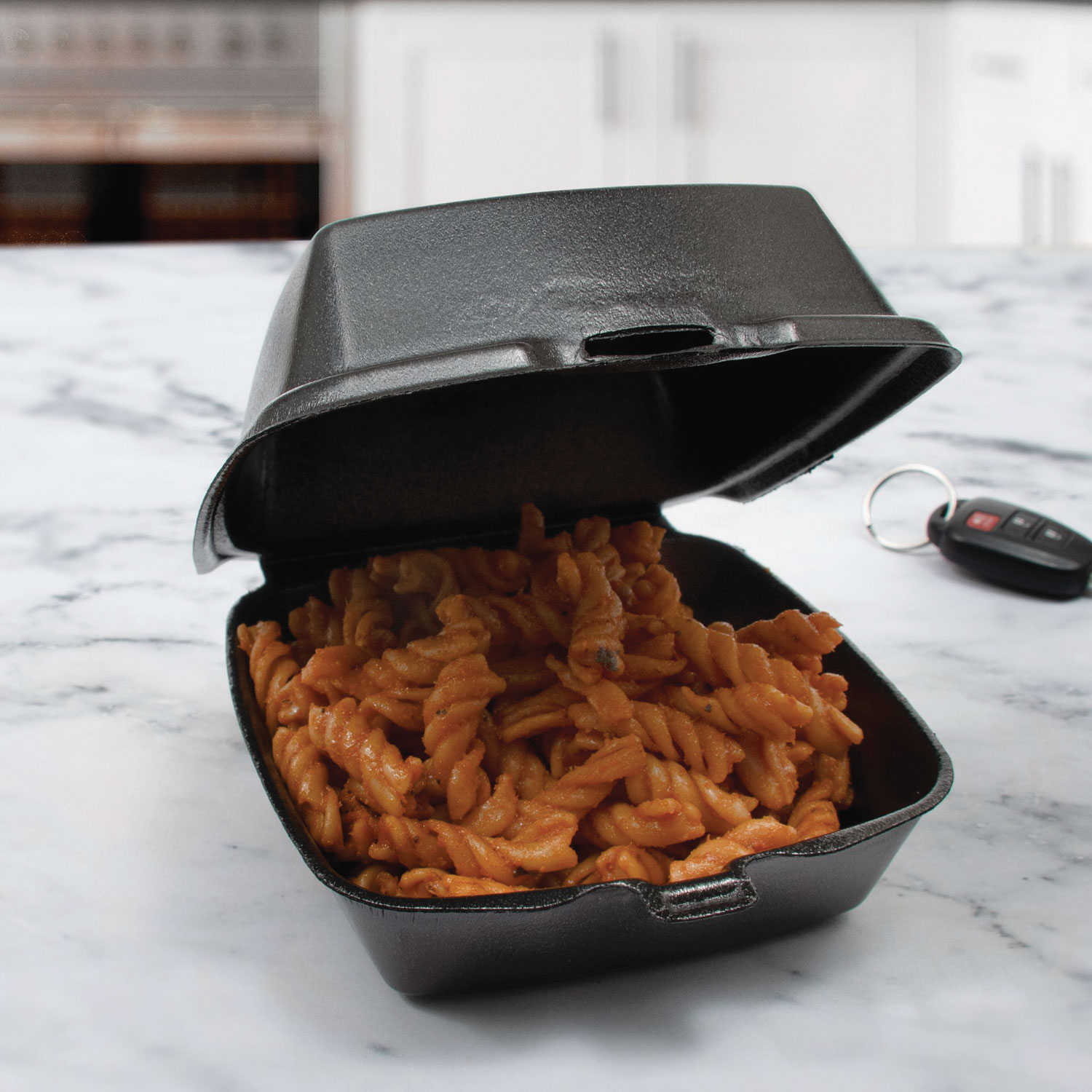 Carryout just wouldn’t be the same without these classic hinged-lid containers! And with these, sending leftovers home with loved ones is a breeze. Use this container for hot or cold foods, from submarine sandwiches to pumpkin rolls. Insulated and non-absorbent, these containers will keep your food at the right temperature without any sauce or grease soaking through. Not only is the lid closure top notch, the perforated hinge makes it easy to remove the lid completely for a more enjoyable dining experience. Whether you’re serving up the best takeout in town, dishing up foodtruck fare or stepping up your holiday gathering leftovers game, these durable containers have your back. Large Sandwich. Food Container Type: Hinged Lid Container; Material(s): Extruded Polystyrene; Material Type: Foam; Color(s): Black.