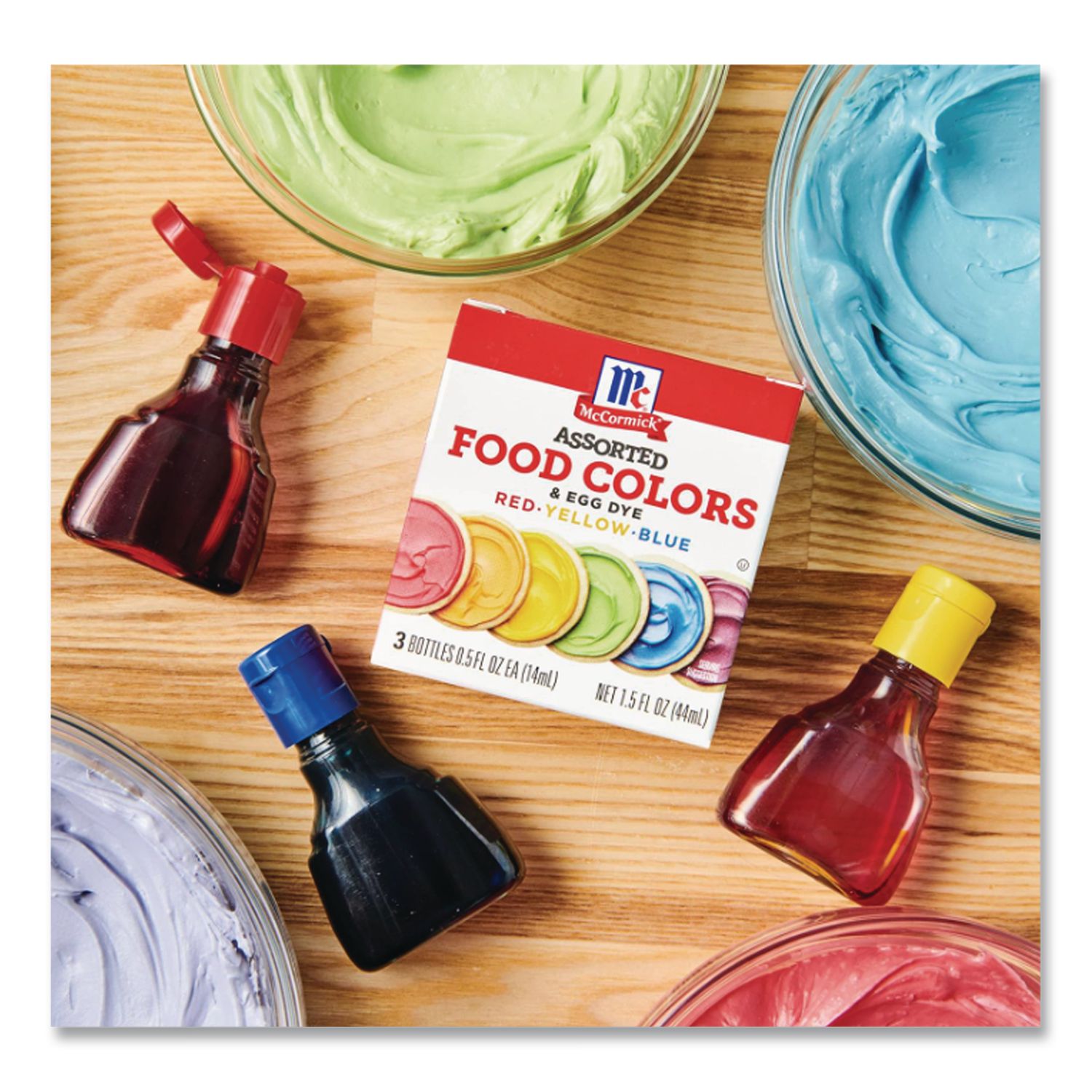 McCormick® food colors/egg dyes make your creations come to life with vibrant colors. The dyes add fun, lively hues to frostings, baked goods, confections and beverages without altering the flavor. The box contains red, yellow and blue food colors, perfect for any festive occasion, holiday or kids’ art project. The color chart on the package shows you how to mix and match drops of the assorted food dyes to color everything from cakes to icings and eggs in every shade of the rainbow. Steal the show at family gatherings with pastel pink heart-shaped Valentine’s Day cookies, Easter eggs dyed in unique shades, Halloween cake pops, or merry red and green decorated Christmas cookies. Food Type: Food Color; Flavor: Unflavored; Volume Capacity: 0.5 oz; Sugar Free: Yes.