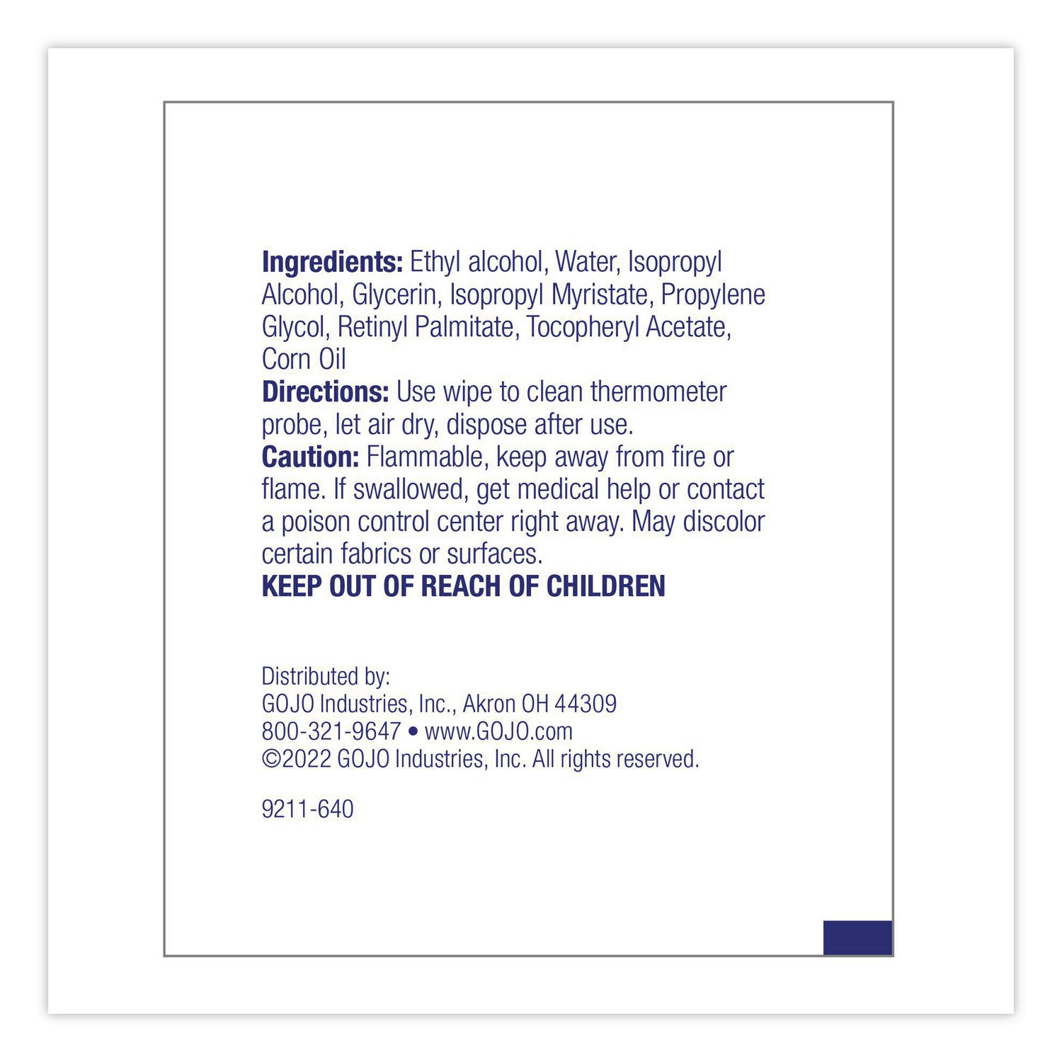 Convenient wipes made with food-contact safe ingredients that quickly and effectively remove food soils on probes. Towel/Wipe Type: Foodservice Thermometer Probe; Color(s): White; Dirt Types: Food Particles; Scent: Fragrance-Free.