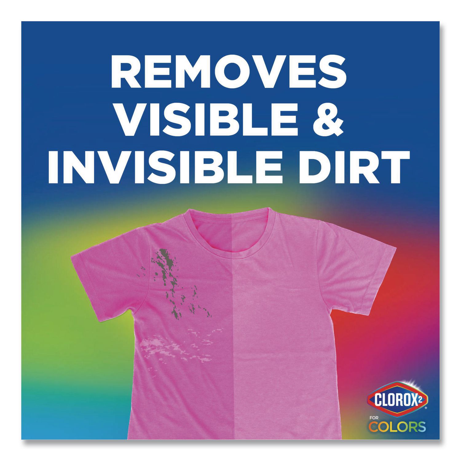 Clorox 2® for Colors Stain Remover and Laundry Additive attacks your toughest stains, including food, grass, blood, set in stains and more. This fast and powerful stain remover activates instantly and even removes 3x more stains vs. the leading value detergent alone. Safe for use in standard and HE washers, this versatile 3-in-1 formula not only removes stains and odors, but also brightens colors and whites. Clorox 2® for Colors Stain Remover and Laundry Additive helps freshen your clothes with a clean scent and is a bleach free formula that is safe for fabrics and colors when used as directed. Application: Laundry Booster; Applicable Material: Fabric; Chemical Compound: Water; Hydrogen Peroxide; Myristyl Amine Oxide; Sodium Hydroxide; Alkylbenzene Sulfonic Acid; Fragrance; Disodium Distyrylbiphenyl Disulfonate; Colorant; Hydrochloric Acid; Dirt Types: Chocolate; Coffee; Dirt; Stains.