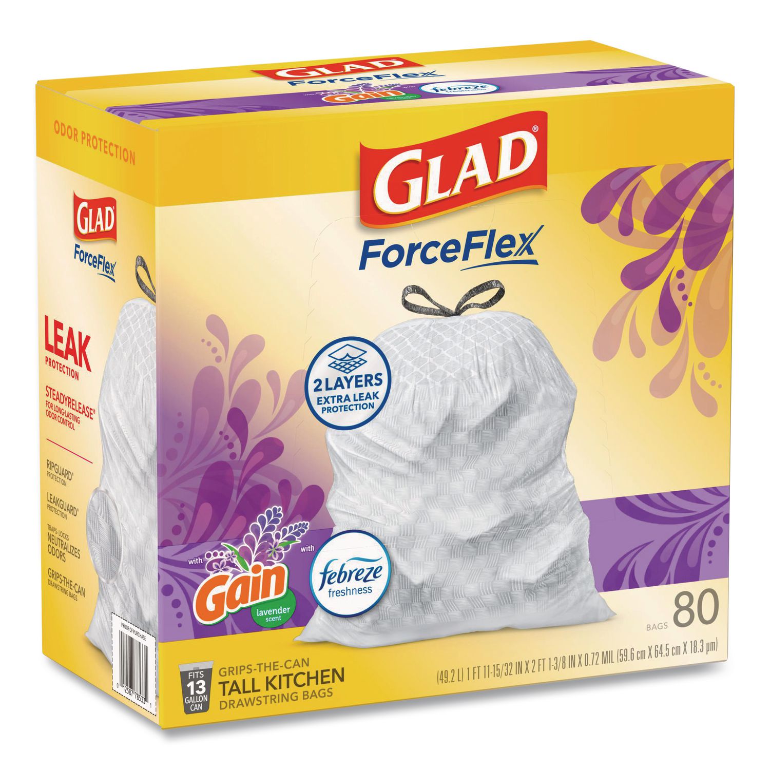 Let the stretchable strength of Glad® ForceFlex™ handle all the messes our busy daily life can throw at it and then some. Glad® Tall Kitchen Drawstring Trash Bags are designed with ForceFlex™ technology to give extra flex as it expands around sharp edges and heavy loads, so you can pack it in while resisting tears, rips and punctures. These trash bags are designed with two layers for extra leak protection. RipGuard® and LeakGuard® technology prevent seepage of liquids and keep trash contained. Fight nasty kitchen odors with the exclusive Glad® trash bag combination of steady release of Febreze freshness and irresistible scent that traps, locks and neutralizes odors. The durable Grips The Can Drawstring ensures a tight grip on the trash can to keep it in place. Take the trash to the curb with no fear of leaks and tears, and no frustration. Value Pack-Stock up and save! Commercial/Consumer Use: Consumer Use; Maximum Volume Range: 11 to 15 gal; Maximum Volume Capacity: 13 gal; Waste Bag Thickness: 0.95 mil.