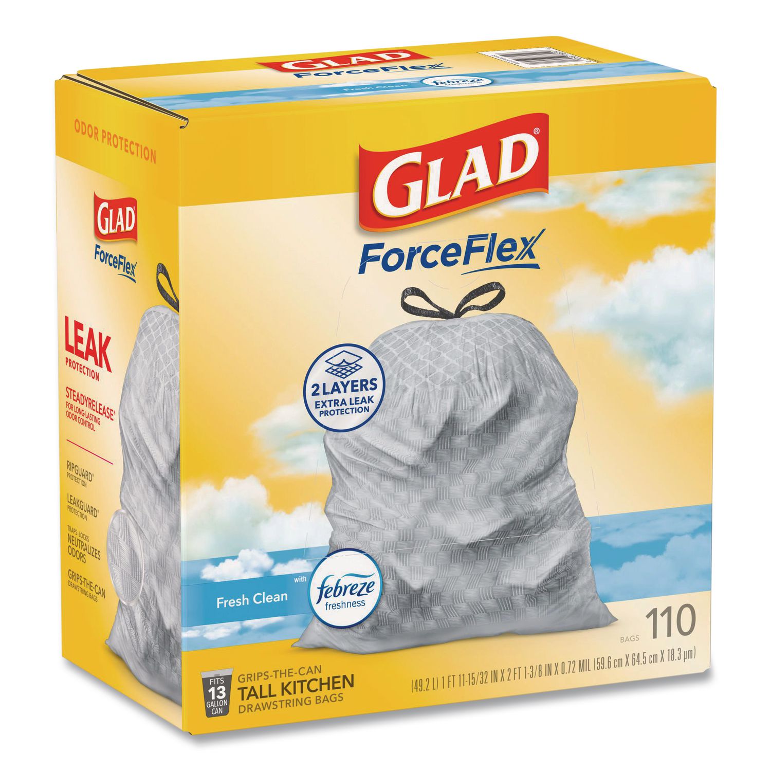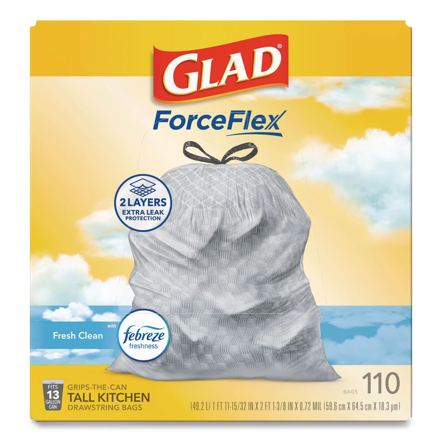 Let the stretchable strength of Glad® ForceFlex⢠handle all the messes our busy daily life can throw at it and then some. Glad® Tall Kitchen Drawstring Trash Bags are designed with ForceFlex⢠technology to give extra flex as it expands around sharp edges and heavy loads, so you can pack it in while resisting tears, rips and punctures. These trash bags are designed with two layers for extra leak protection. RipGuard® and LeakGuard® technology prevent seepage of liquids and keep trash contained. Fight nasty kitchen odors with the exclusive Glad trash bag combination of steady release of Febreze freshness and irresistible Fresh Clean scent that traps, locks and neutralizes odors. The durable Grips The Can Drawstring ensures a tight grip on the trash can to keep it in place. Take the trash to the curb with no fear of leaks and tears, and no frustration. Commercial/Consumer Use: Commercial Use; Maximum Volume Range: 11 to 15 gal; Maximum Volume Capacity: 13 gal; Weight Capacity (Dry): 13 gal.