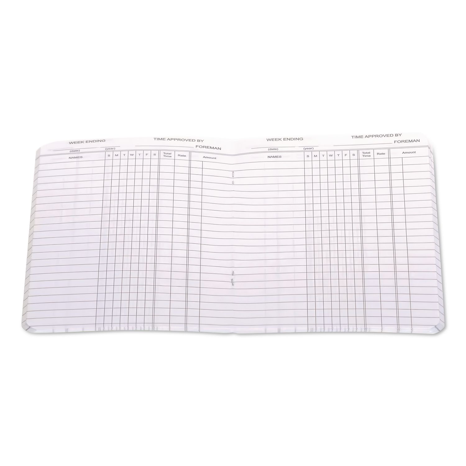 Portable, durable foreman’s time book helps you increase productivity. Stiff green pressboard cover and cloth spine are built for long-term durability. Store records for up to 23 employees, and conveniently update those records, wherever you are, in or out of the office. One week per two page spread. Interior pages are made of high-grade, white writing paper. Handy 6 3/4″ x 4 1/8″ pocket. Form Type Details: Employee Attendance/Status/Time; Dated: No; Forms Per Page: 1; Forms Per Page Layout: One Form per Two-Sheet Spread.
