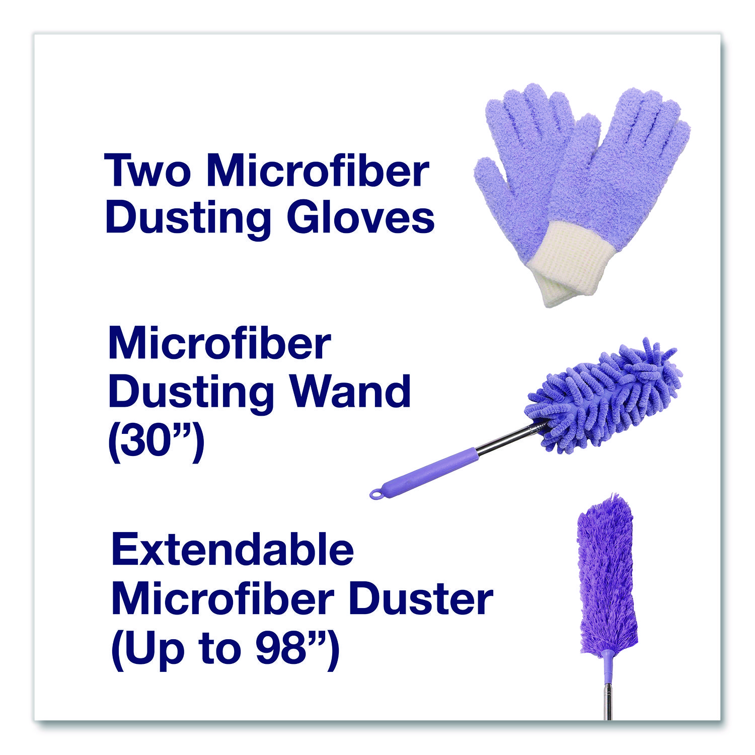 Meet the only dusting kit you’ll ever need. Designed to make cleaning easy, fast, and even a little satisfying, this four-piece set includes: An extendable microfiber duster for high and hard-to-reach places like ceiling fans, crown molding and behind furniture. A flexible microfiber wand that bends and slides into vents, blinds and between appliances. Two microfiber dusting gloves that let you literally wipe away dust with a swipe of your hand—perfect for shelves, picture frames and décor. Each tool is crafted with ultra-soft, high-density microfiber to trap dust—not just push it around. Washable and reusable, so you can ditch disposable dusters for good. Whether you’re doing a deep clean or just a quick touch-up, this kit keeps your home spotless from top to bottom. Bristle Material: Microfiber; Bristle Length: 1″; Bristle Depth: 1″; Bristle Color: Purple.