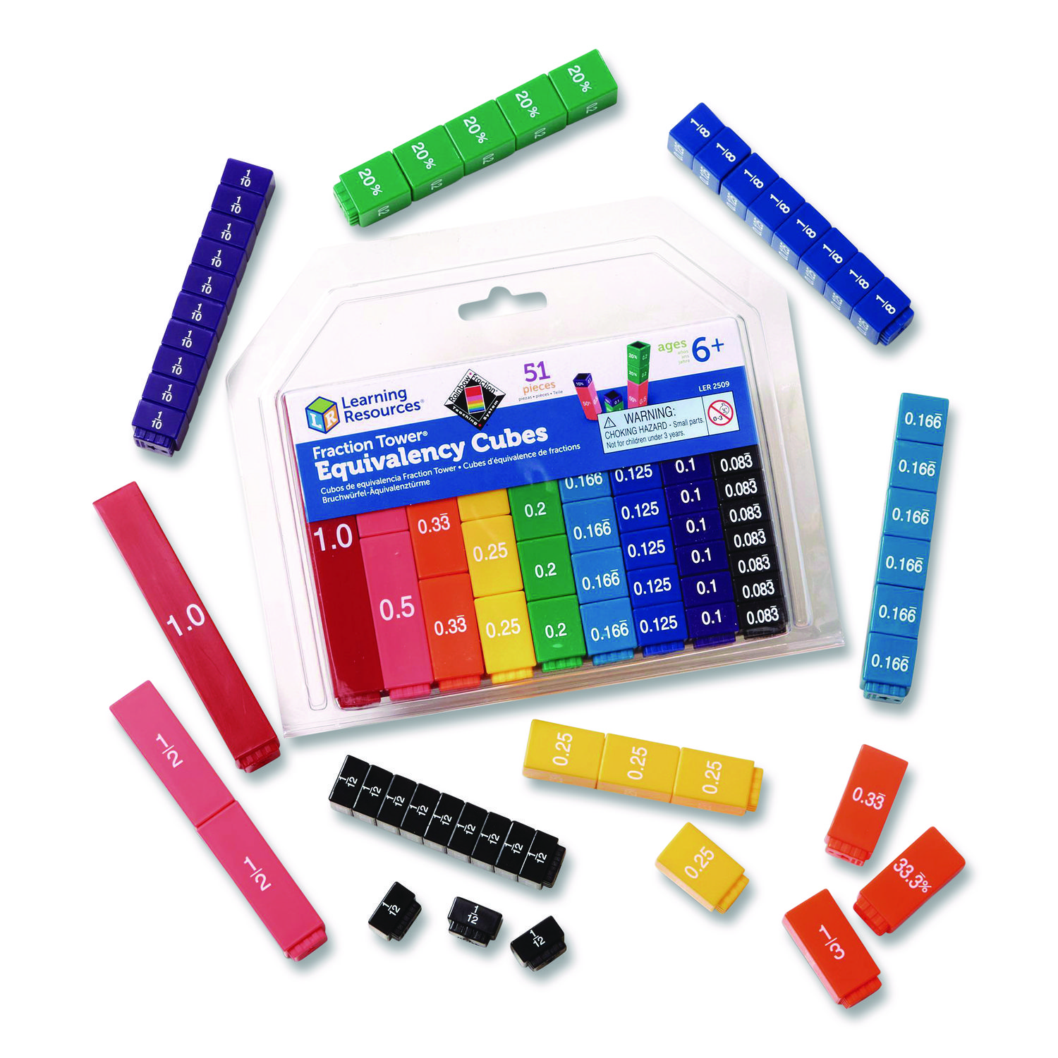 Help young students learn math concepts such as decimals, percentages and fractions with these durable, interlocking cubes. Children will learn by building simple, graphic mathematical models that clearly demonstrate fraction relationships. Cubes can be used alone or with Fraction Tower® Activity sets. Nine Sizes. Subject Area: Mathematics; Specific Subject: Decimals, Fractions & Percentages; Age Recommendation: Ages 6 and Up; Grades: Grades 1 to 4.