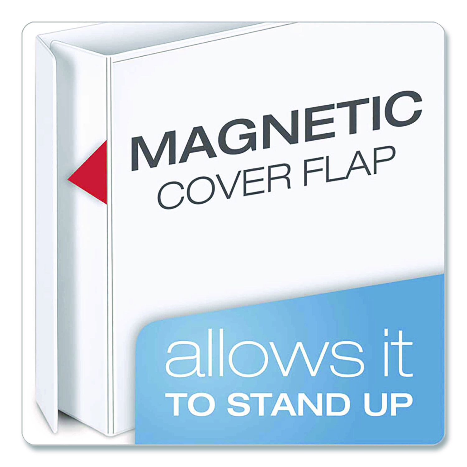 Magnetic flap closure stabilizes binder, allowing it to stand and stack unaided. Five color ID rings (provided with each binder) snap in and out for easy identification. Clear overlay for customization on all three sides with one letter-sized sheet. ONE-TOUCH® Easy Open® rings open, close and lock with one simple motion. Non-stick, PVC-free cover with clear overlay for customization of front, back and spine. Binder Type: Ring; Binder Style: View; Binder Size Capacity: 2″; Binder Sheet Capacity: 565.