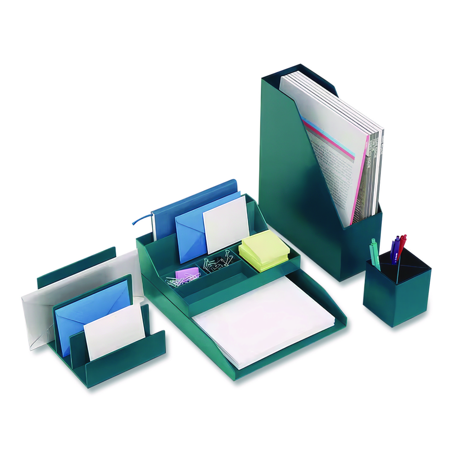 Master the art of desktop organization, and sort all of your paperwork by priority or project to enhance your productivity. Stacking design allows you to develop a personalized desktop setup. Gloss-finished body provides a contemporary appearance that integrates easily into modern office environments. Crack- and break-resistant plastic stands up to the rigors of regular use. Front-Load. Number of Compartments: 1; For File Size: Letter; Load Orientation: Front; Color(s): Teal.