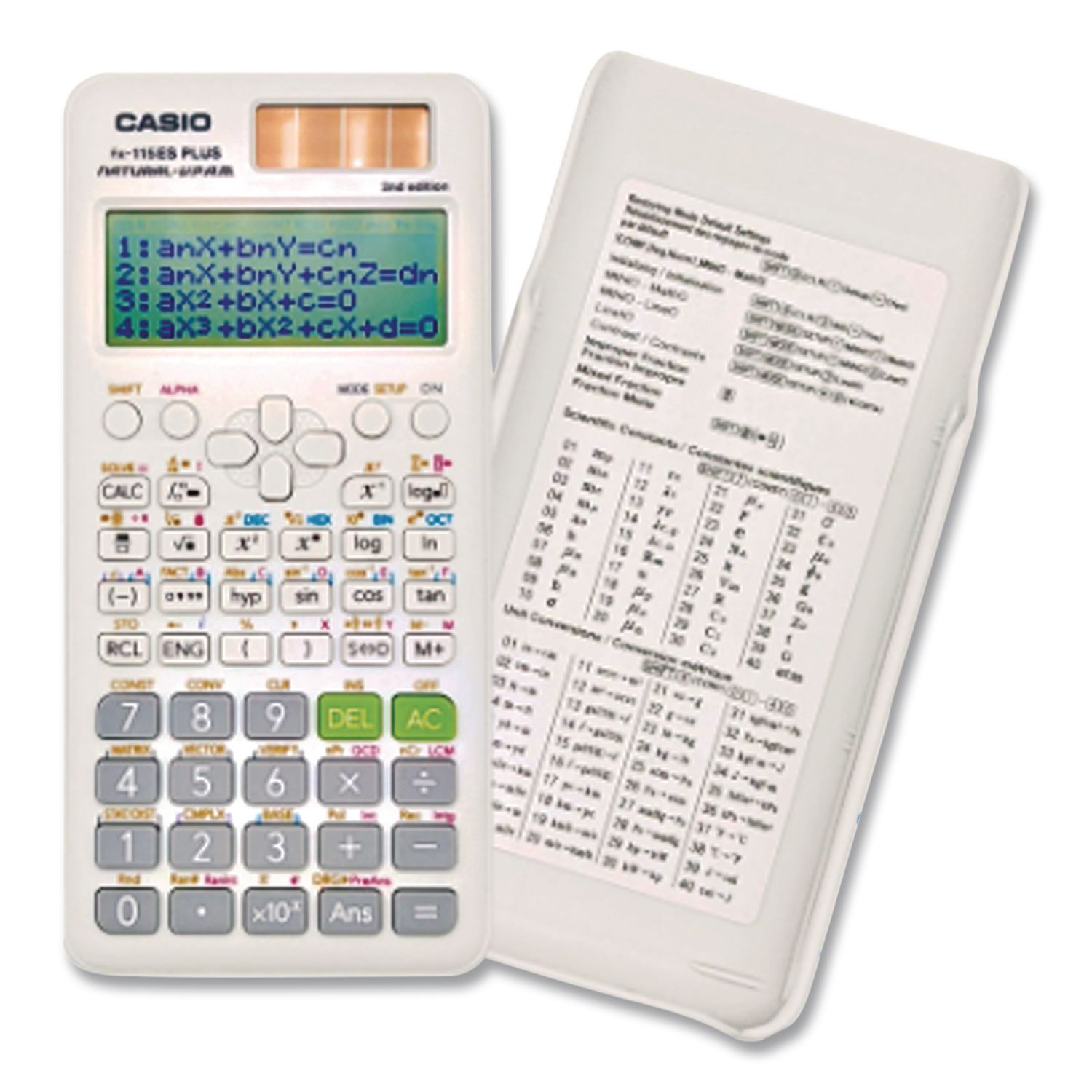 Casio FX-115ESPLS2-S 2nd Edition Scientific Calculator with slide on hard case and sleek new design. With the Natural Textbook Display, in addition to advance Statistics, Matrix, and Conversion functionality, is a perfect choice for high school and college students. Recommended for students taking General Math, Pre-Algebra, Algebra I and II, Geometry, Trigonometry, Statistics, Calculus, Chemistry, Engineering. Power Source(s): Battery; Solar; Display Notation: Natural Textbook; Number of Display Digits: 12; Display Characters x Display Lines: 12 x 2.