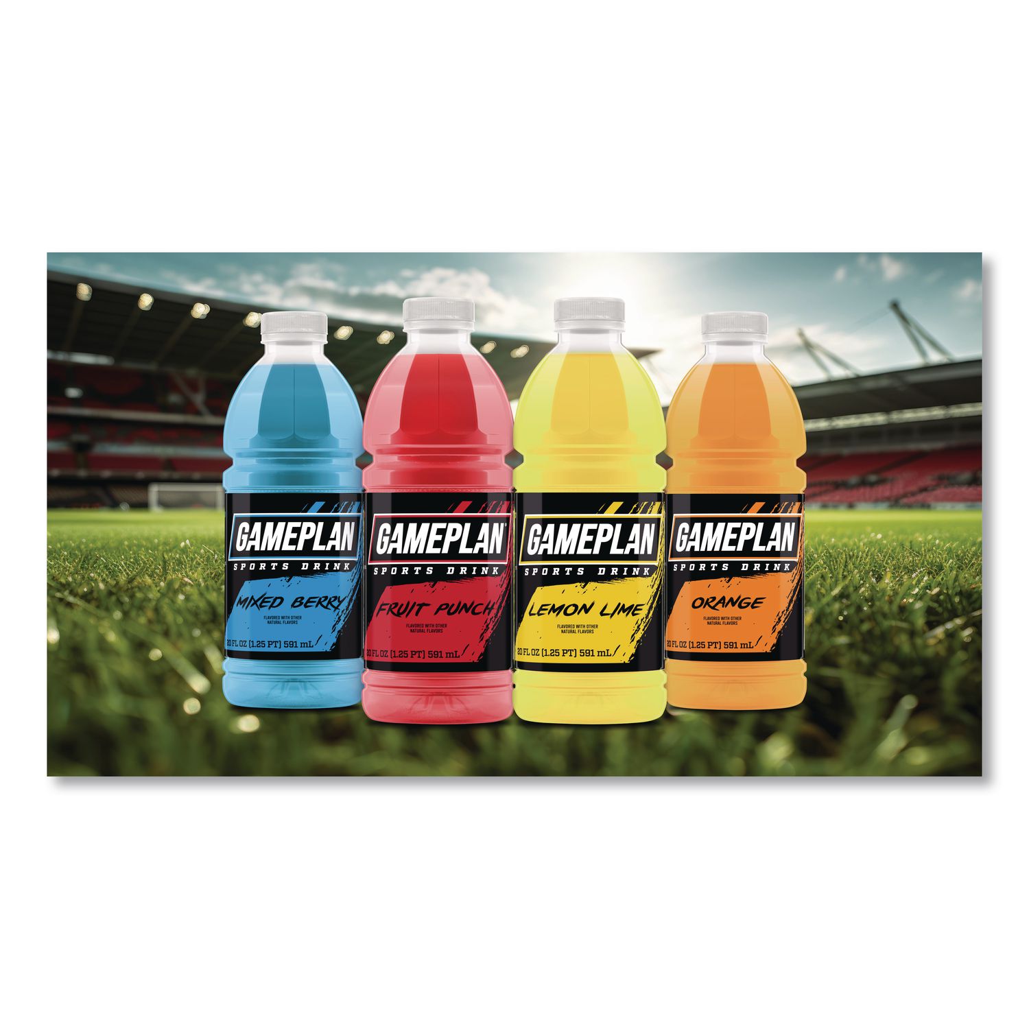 A tasty sports drink made with natural flavors. Convenient hydration solution. Available in mouth-quenching flavors. Get your hydration with Gameplan®. Beverage Type: Sports Drink; Flavor: Mixed Berry; Product Packaging: Bottle; Volume Capacity: 20 oz.
