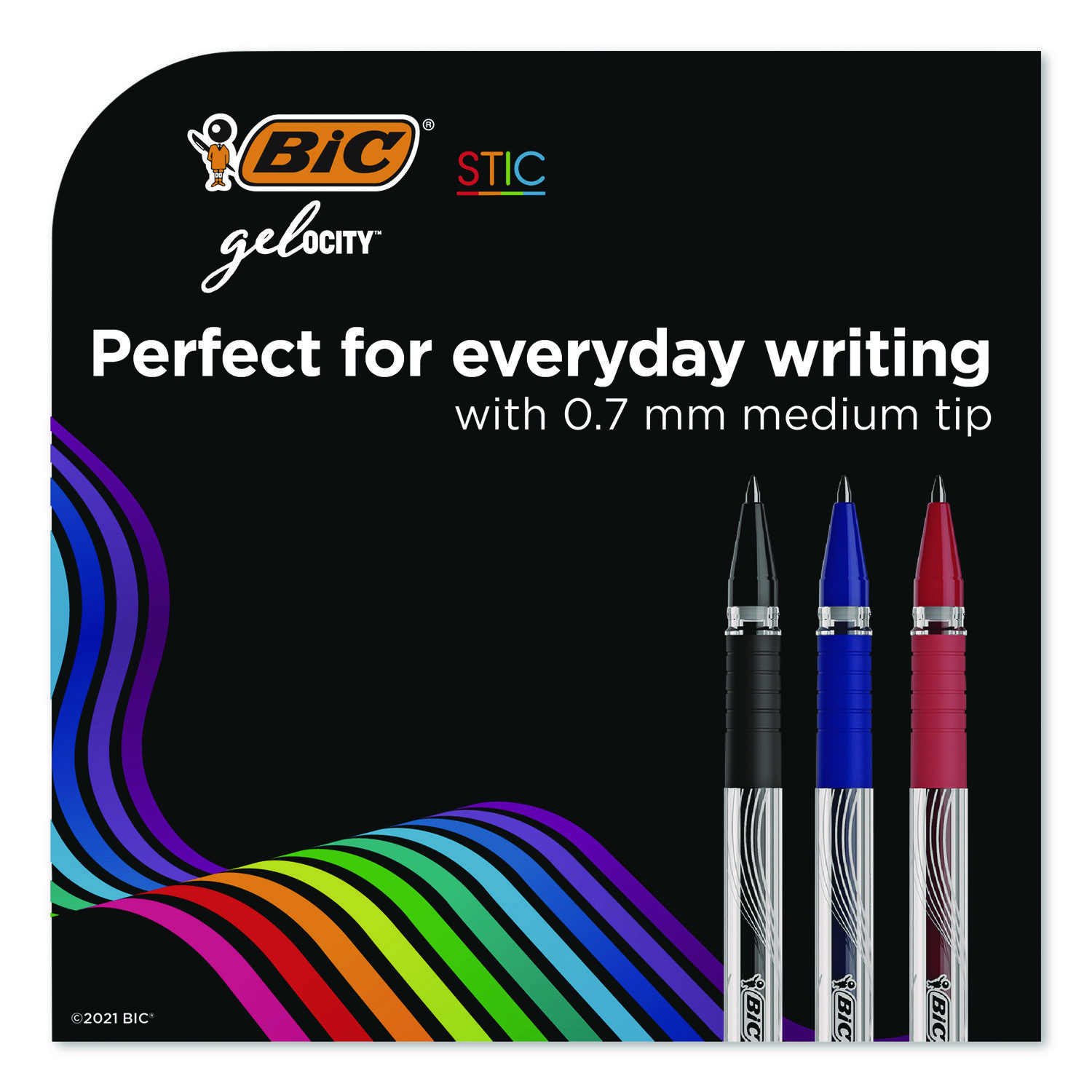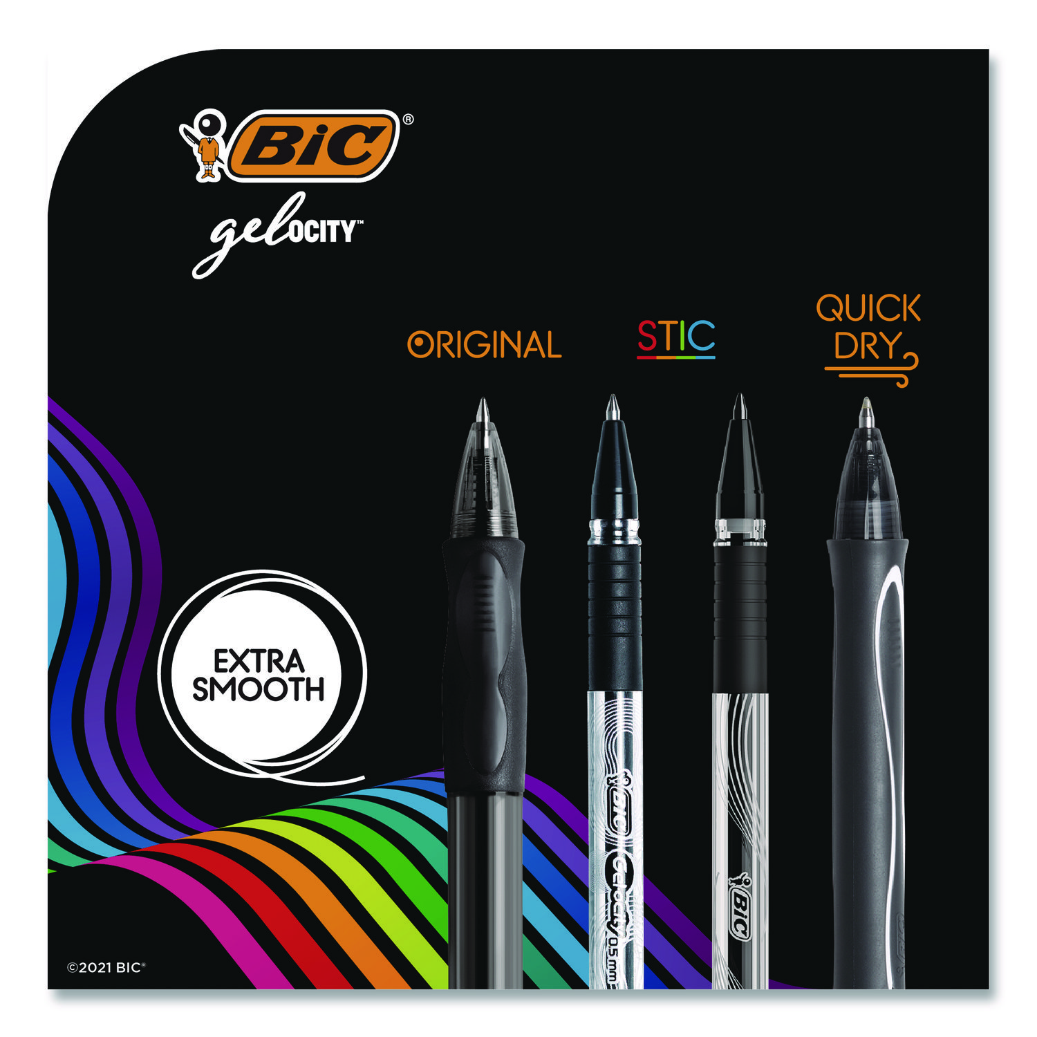 Enjoy a super-smooth writing experience with BIC® Gel-ocity™ STIC Gel Pens. Ideal for note-taking, journaling and a variety of everyday writing activities, these pens feature a unique, smear-free gel ink that dries in as little as five seconds, while their easy-flow system and high-quality points ensure fluid, precise, nearly effortless writing. Their smooth round barrels with rubberized grips rest comfortably in your hand, and their translucent design with ink-color-matched accents make it easy to grab the right color while allowing you to keep an eye on your remaining ink supply. Choose Gel-ocity™ STIC Gel Pens; they’re sure to make a striking impression at work, at school and at home. Pen Sub-Brand & Product Family: Gel-ocity™ STIC; Pen Type: Gel Pen; Pen Style: Stick; Pen Tip Type: Conical.